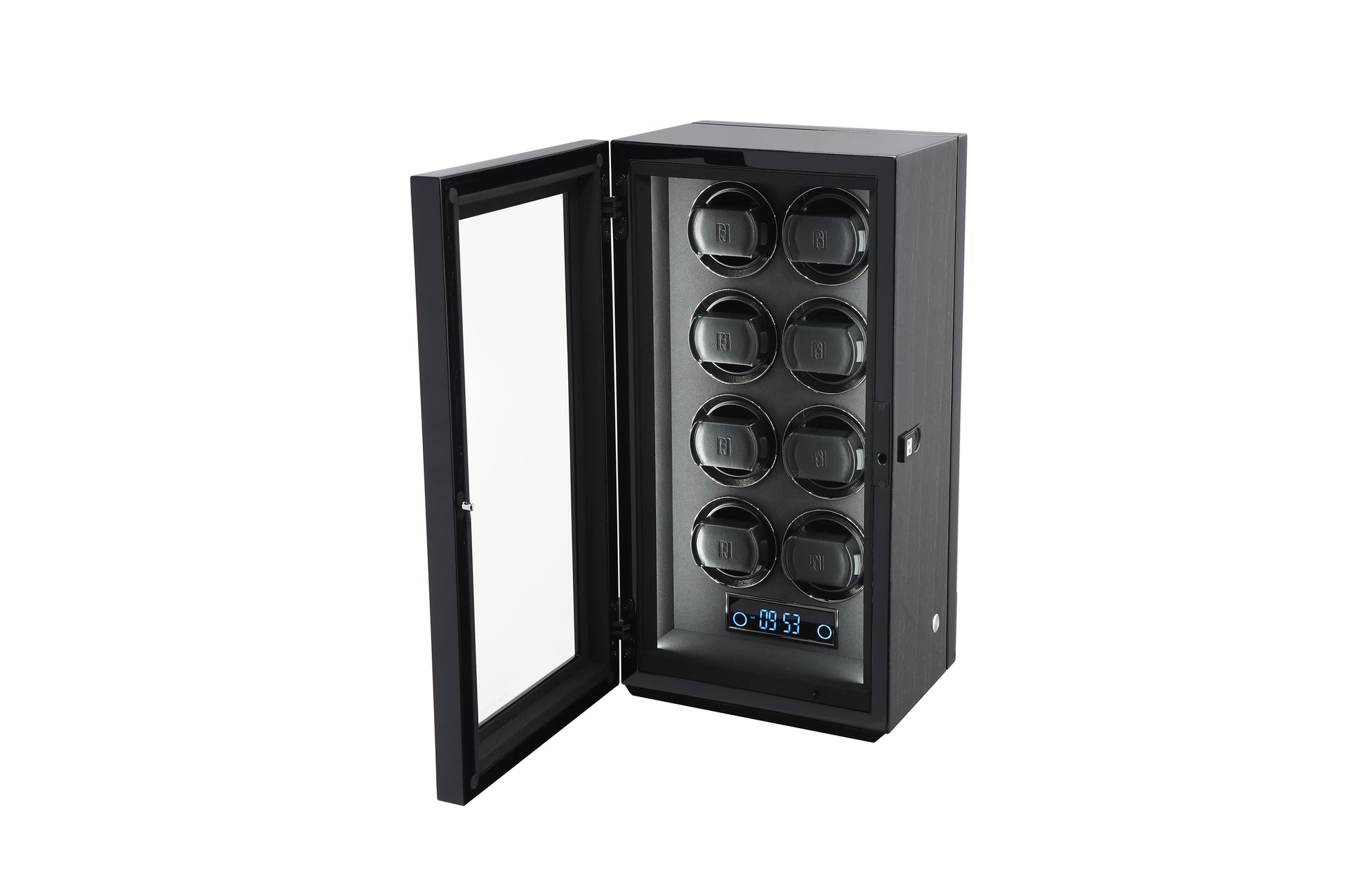 The beautifully handcrafted wooden case of the watch winder for 8 watches is finished with 5 layers of high-gloss varnish, making it a real visual highlight. The high-quality interior is lined with black velour to show off your favourites.