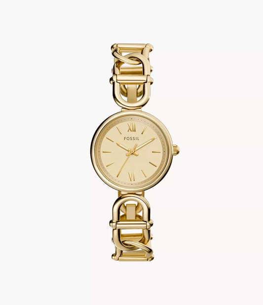 This 30mm Carlie features a gold satin dial, three-hand movement and gold-tone stainless steel bracelet....
