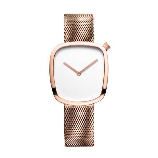The polished rose gold coloured stainless steel case, made of pure, high quality, medical grade...