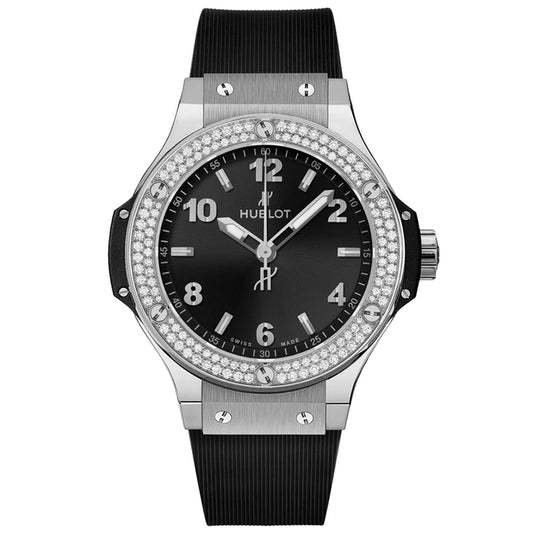The Hublot Big Bang Steel Diamonds 361.SX.1270.RX.1104 has a quartz movement, Black dial color, Rubber...