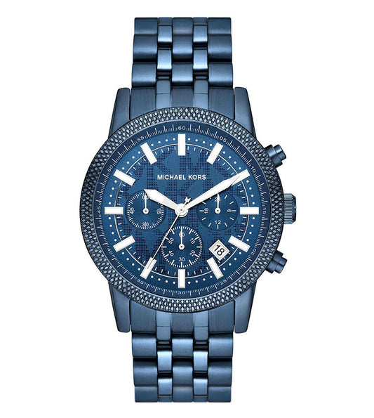 This 43mm Michael Kors chronograph watch features a sleek blue sunray dial with a matching...