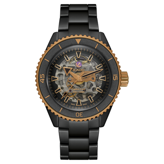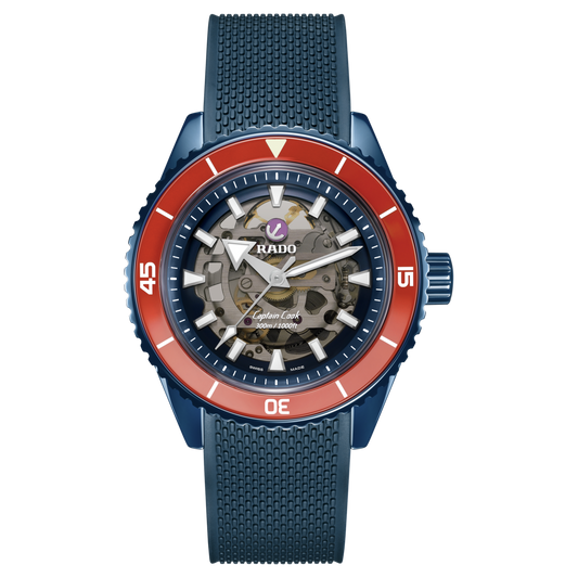 The Captain Cook High-Tech Ceramic Skeleton showcases its innovative R808 movement, a marvel of contrasts,...