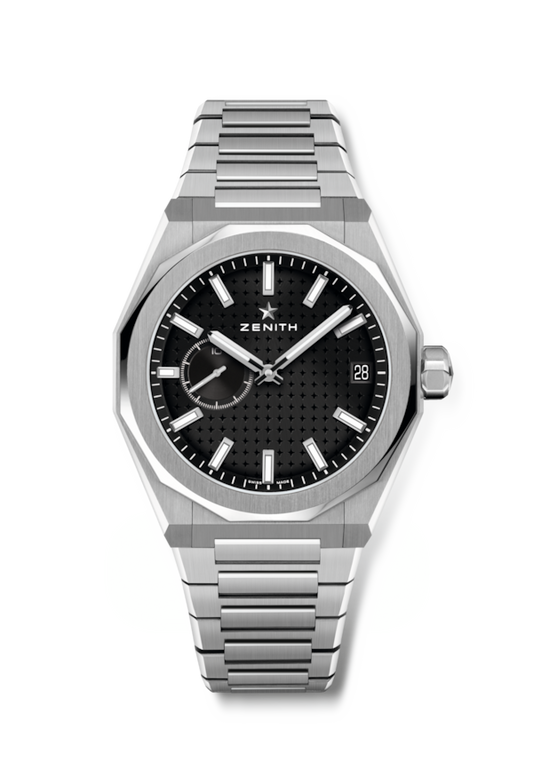 DEFY Skyline in a 41mm steel octagonal case with a faceted bezel, featuring a black-toned...