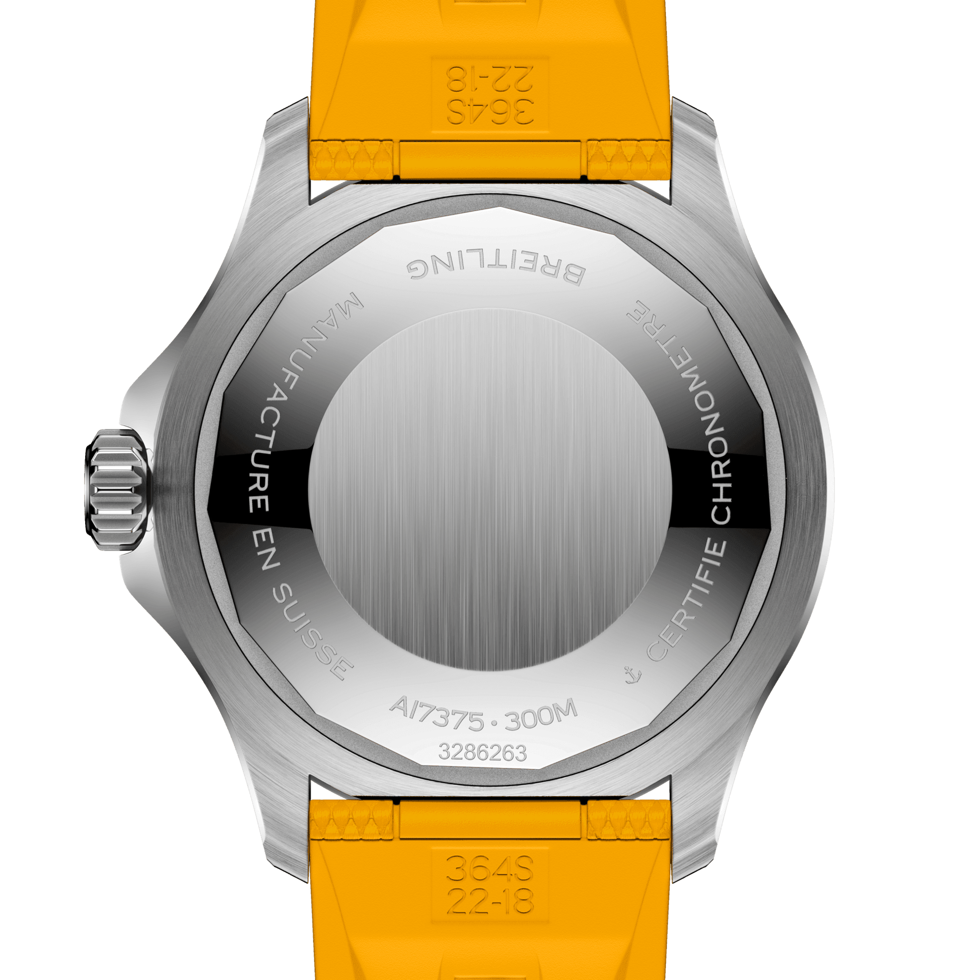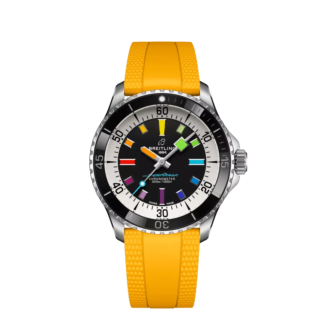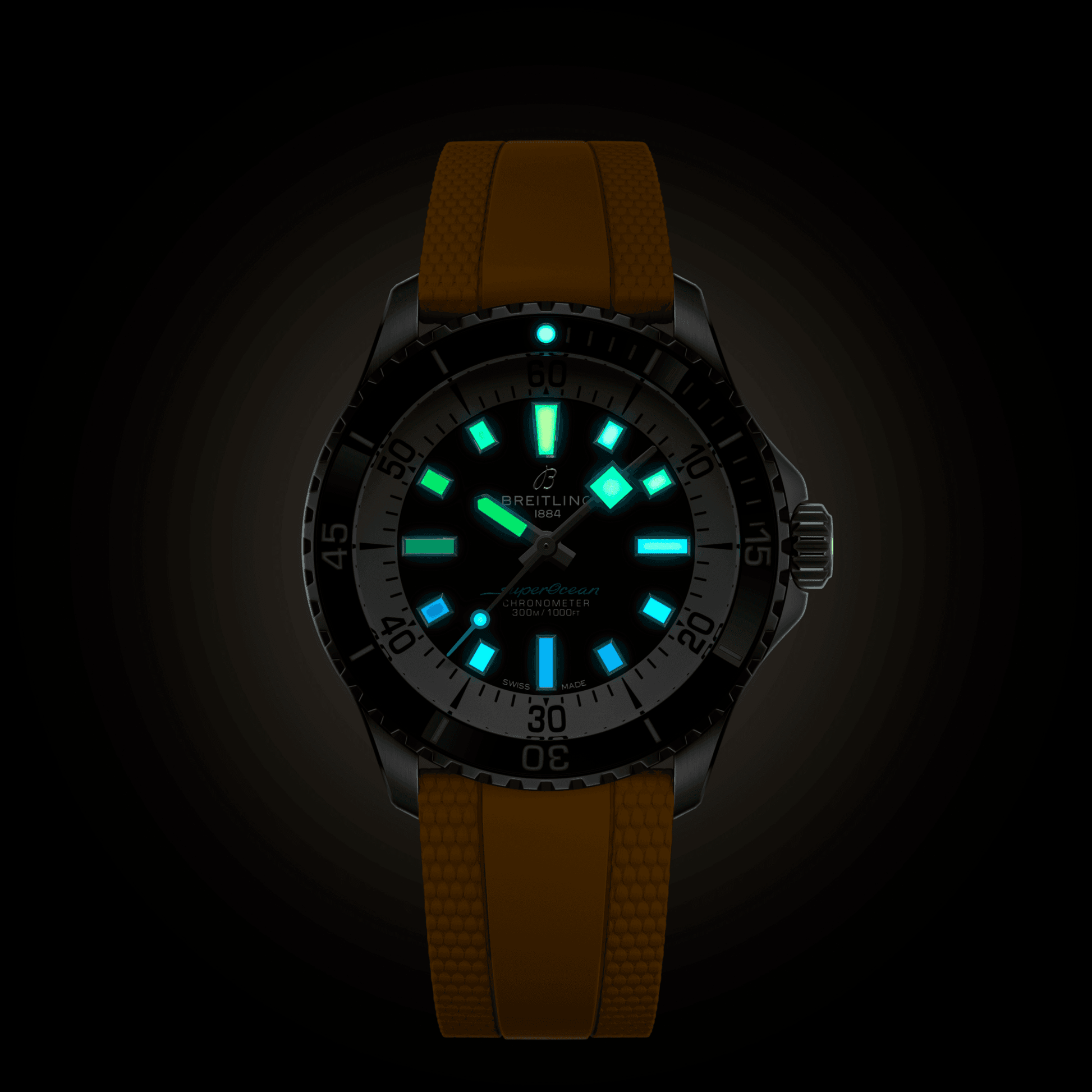 Performance and style for all your water-based pursuits. In the 1960s, the new sport of scuba diving was all the rage. For divers, timing was everything, and Breitling set out to give them the most clear-cut dive watch possible by eliminating any feature that didn’t support their lifesaving needs underwater. This pared-down watch was named the Superocean Slow Motion. What remained were clean lines, chunky luminescent indexes, squared-off hands and a high-contrast dial ring, all aimed at maximum legibility. Practical, yes. But what people really fell in love with was the look. The new Superocean retraces the Slow Motion's celebrated design codes, while adding modern features, like a scratch-proof ceramic-inlayed bezel and brightly colored dials. Broad hands and indexes in a rainbow gradient of luminescent Super-LumiNova® allow for easy readability (and extra fun). The watch is water resistant to 300 m (1,000 ft), as well as being shock-, sand- and saltwater-resistant. The bronze version uses a special alloy that has excellent resistance to corrosion, yet will still develop a subtle patina over time that makes the watch even more unique. The rubber strap comes with a folding clasp that allows for micro-adjustments of up to 15 mm for easy wear over rashies and wetsuits. For safety, the bezel is uni-directional. Best of all, this is no longer strictly a dive watch—surf with it, swim with it, hit the beach bar with it, then wear it out to dinner. The Superocean perfectly balances the nostalgia of its heritage with a fresh new look.