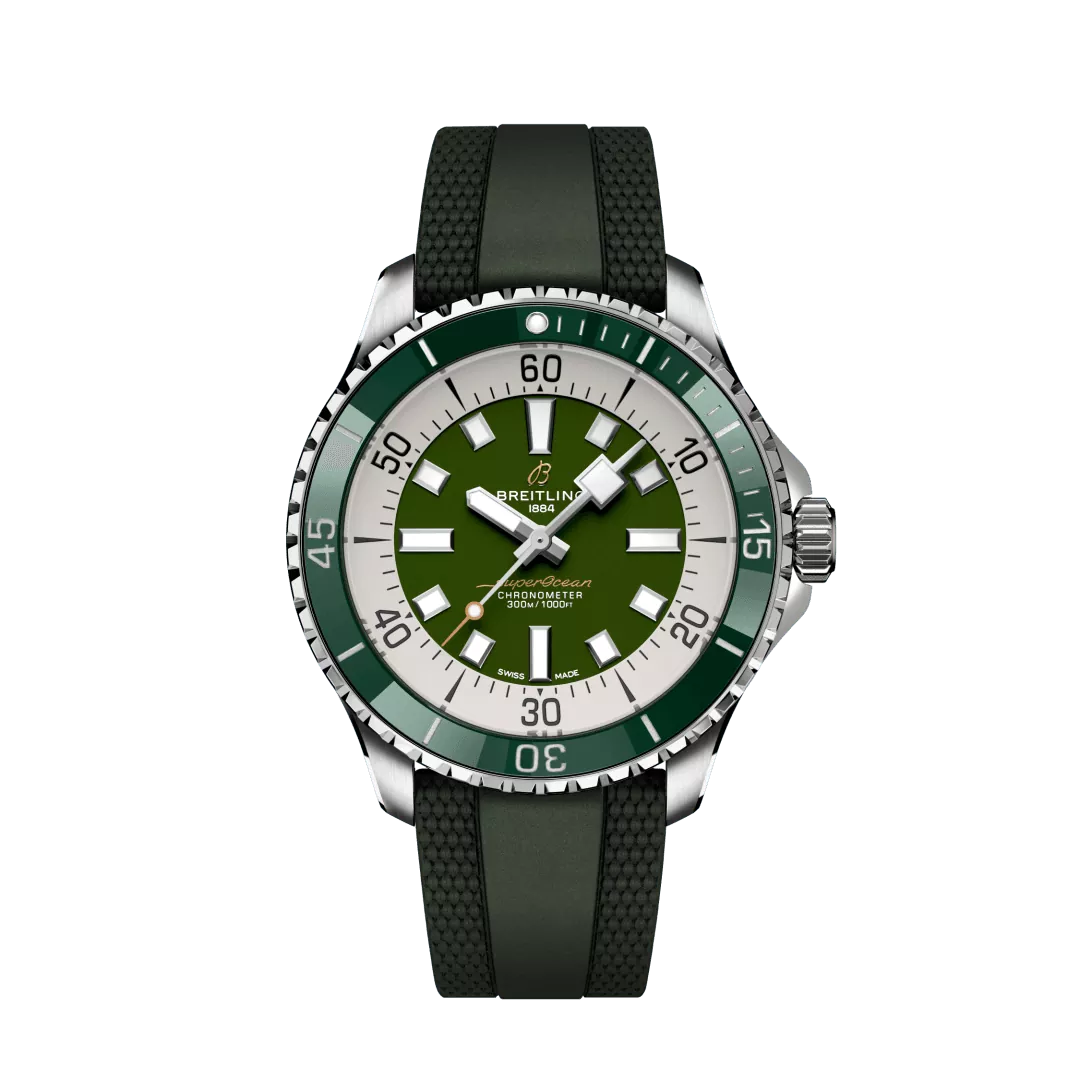 Performance and style for all your water-based pursuits. In the 1960s, the new sport of scuba diving was all the rage. For divers, timing was everything, and Breitling set out to give them the most clear-cut dive watch possible by eliminating any feature that didn’t support their lifesaving needs underwater. This pared-down watch was named the Slow Motion. What remained were clean lines, chunky luminescent indexes, squared-off hands and a high-contrast dial ring, all aimed at maximum legibility. Practical, yes. But what people really fell in love with was the look. The new Superocean retraces the Slow Motion's celebrated design codes, while adding modern features, like a ceramic-inlayed bezel and brightly colored dials. Broad hands and indexes in luminescent Super-LumiNova® allow for easy readability underwater. The watch is water resistant to 300 m (1000 ft), as well as being shock-, sand- and saltwater-resistant. The bronze version uses a special alloy that has excellent resistance to corrosion, yet will still develop a subtle patina over time that makes the watch even more unique. The two strap options (rubber and metal bracelet) have a folding clasp that allows for micro-adjustments of up to 15 mm for easy wear over rashies and wetsuits. Its scratch-proof ceramic inlayed bezel will never wear or fade. For safety, the bezel is uni-directional on most sizes and bi-directional with a patented lock on the 46 mm. Best of all, this is no longer strictly a dive watch—surf with it, swim with it, hit the beach bar with it, then wear it out to dinner. The Superocean perfectly balances the nostalgia of its heritage with a fresh new look.