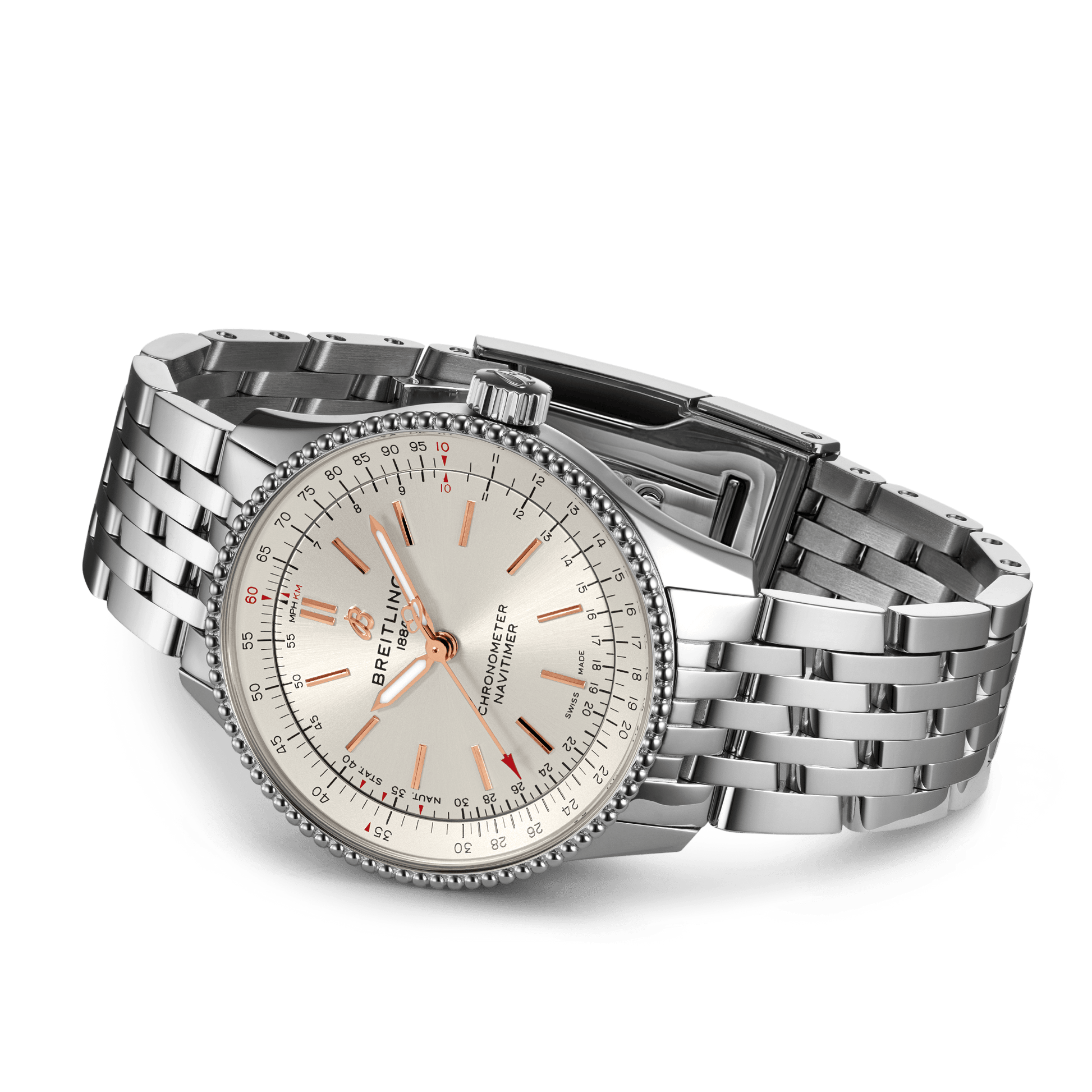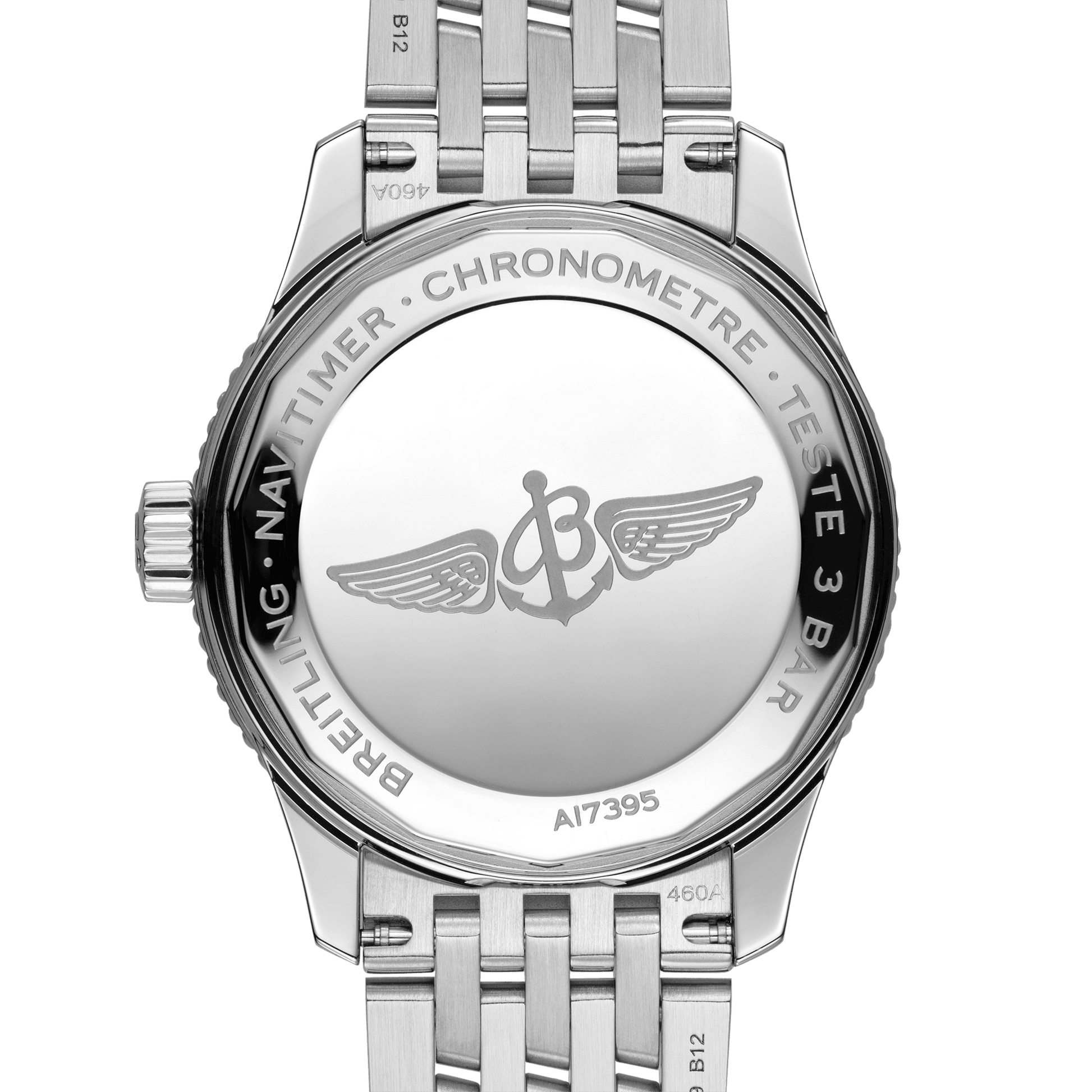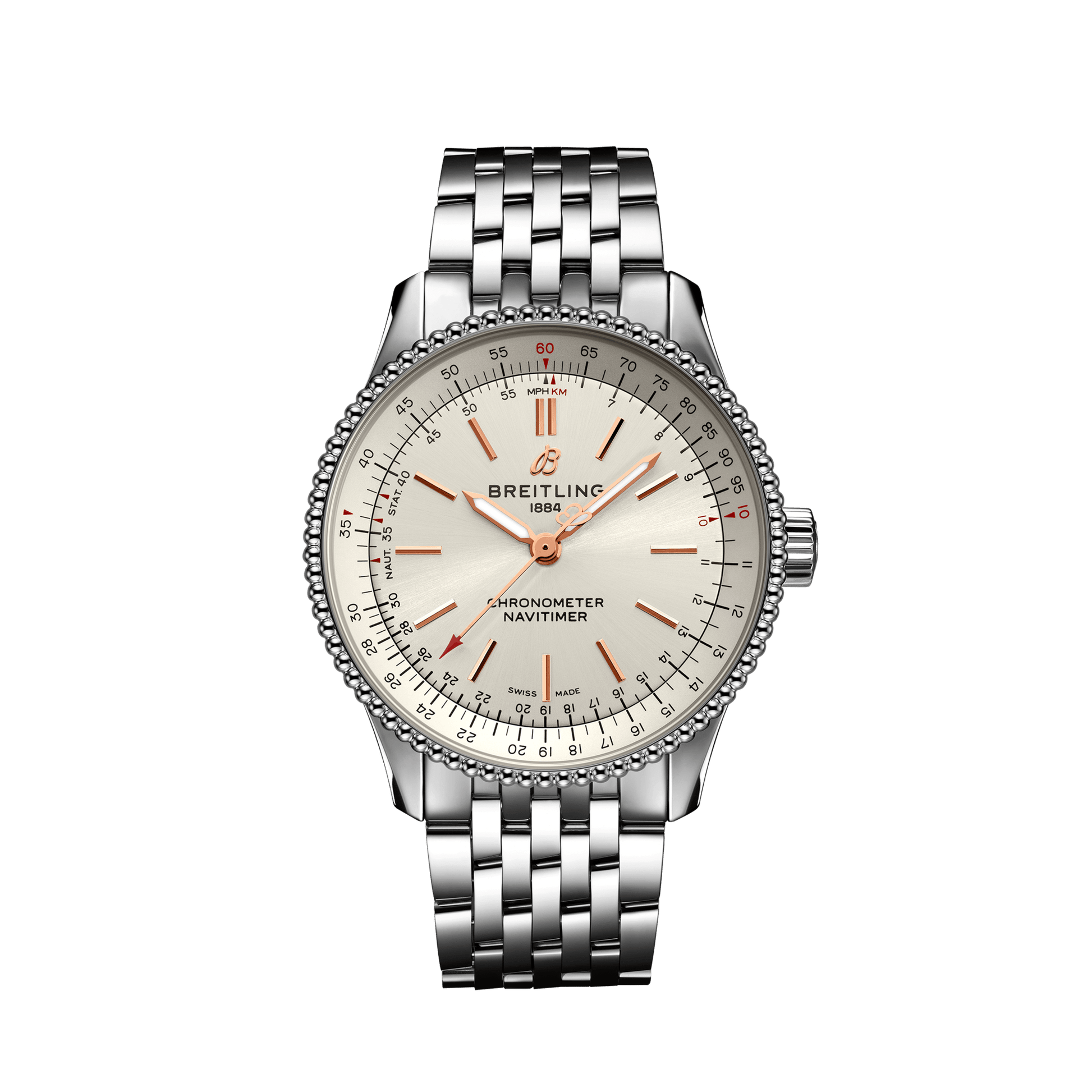 Refined and elegant, the Navitimer Automatic 35 combines the historic appeal of a true icon with the sophistication of a contemporary timepiece. Available in a variety of materials including stainless steel and 18k red gold, the 35 mm case features a beaded bezel and a range of elegant dial colors, as well as diamond-set white mother of pearl. Offered either with a matching bracelet or alligator strap that fits both a stainless steel pin or folding buckle, the Navitimer Automatic 35 is powered by the Breitling Caliber 17, a COSC-certified chronometer.