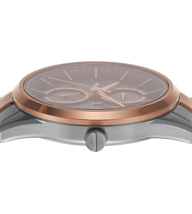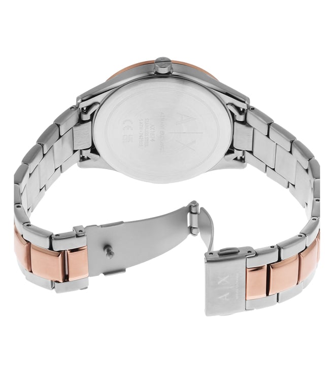 Give your timepiece collection a completion with this men's analog watch from Armani Exchange. The blue round dial is protected by a mineral glass. It has a crown for time adjustment. The stainless steel strap comes in a two tone hue that further elevates the look of the timekeeper. Armani Exchange's 42mm watch features a blue sunray dial, multifunction movement and two-tone stainless steel bracelet.