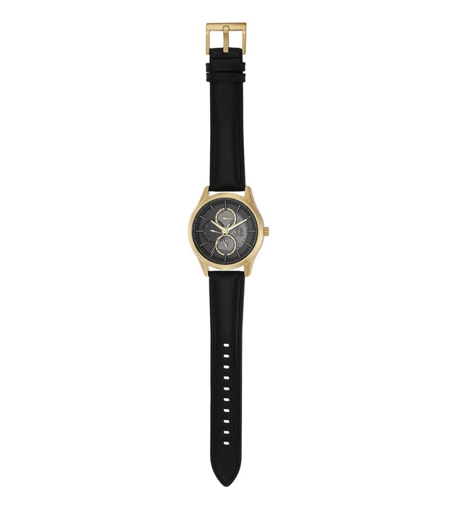 Enhance your style quotient by wearing this men's analog watch from Armani Exchange. The black round dial is protected by a mineral glass. It has a crown for time adjustment. The genuine leather strap comes in a black hue that further elevates the look of the timekeeper. Armani Exchange's 42mm watch features a black sunray dial, multifunction movement and black leather strap.