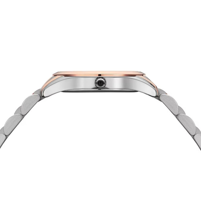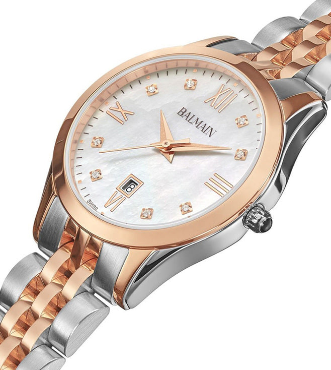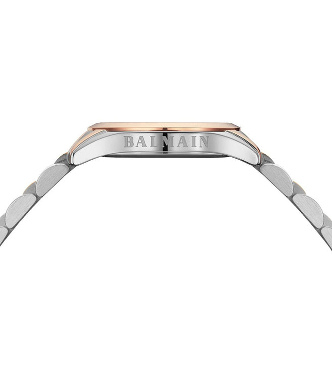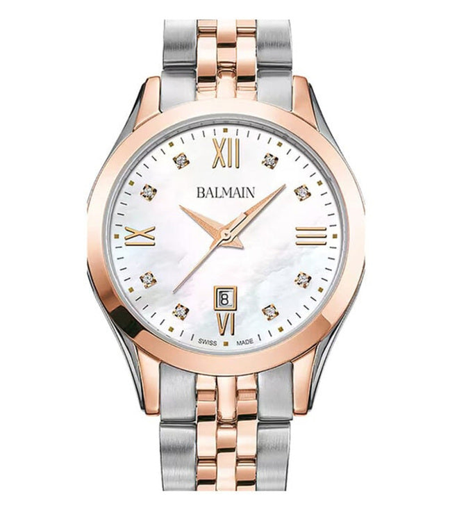 Add a classy touch to your attire by wearing this women's analog watch from Balmain. The white MOP round dial is protected by a sapphire glass. It has a crown for time adjustment. The stainless steel strap comes in a two tone hue that further elevates the look of the timekeeper. Besides, it is completed with a butterfly with pushers clasp to ensure a secure fit on the wrist.