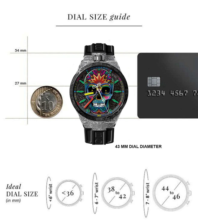 The Tulum Skull watch presents a spectacular union of two iconic symbols, skulls and tattoos, expressed with inspired design and unparalleled realism. The watch itself is a tattoo artist's canvas that comes to life, with bright and colorful motifs in relief on the dial, and the engraving mastery on the case and strap. A timepiece to reflect the fearlessness of the pioneer who blazes a new trail, challenges conventions, and opens new realms of creativity.