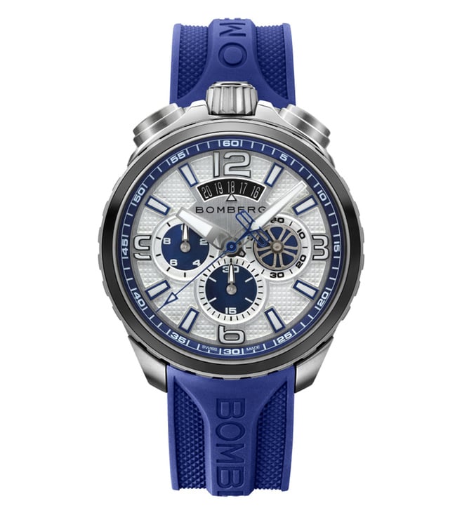 This classic Bomberg Bolt-68 Heritage watch is tinted a deep blue - on the periphery of the dial and on the chronograph timing wheels. In addition, the bright blue silicon strap sets off the watch perfectly, emphasizing its cool, casual royal tones. This elegant, powerful-looking wristwatch would make an ideal gift.