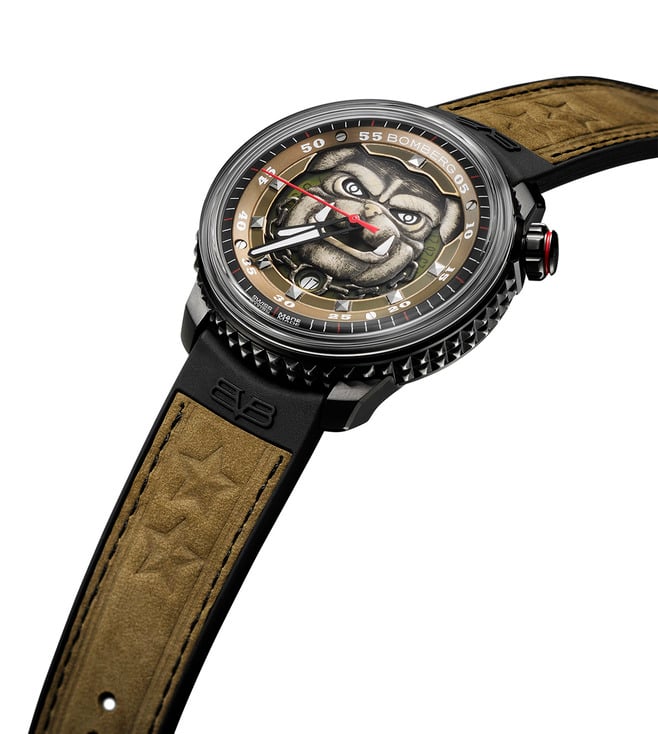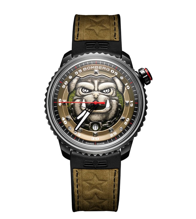 A smirking bulldog on the dial, a powerful Swiss automatic movement for precision, and a lot of incredible details make this watch one of its kind. The signature offset of the crown at 2 o'clock and the leather strap with embossed stars motifs and contrasting dark green stitching only underscore the statement made by this watch. Stainless steel and PVD coating for the case speak to its substance and character. The Super-luminova photoluminescent coating on the indexes and hands ensures perfect legibility even in the darkest conditions