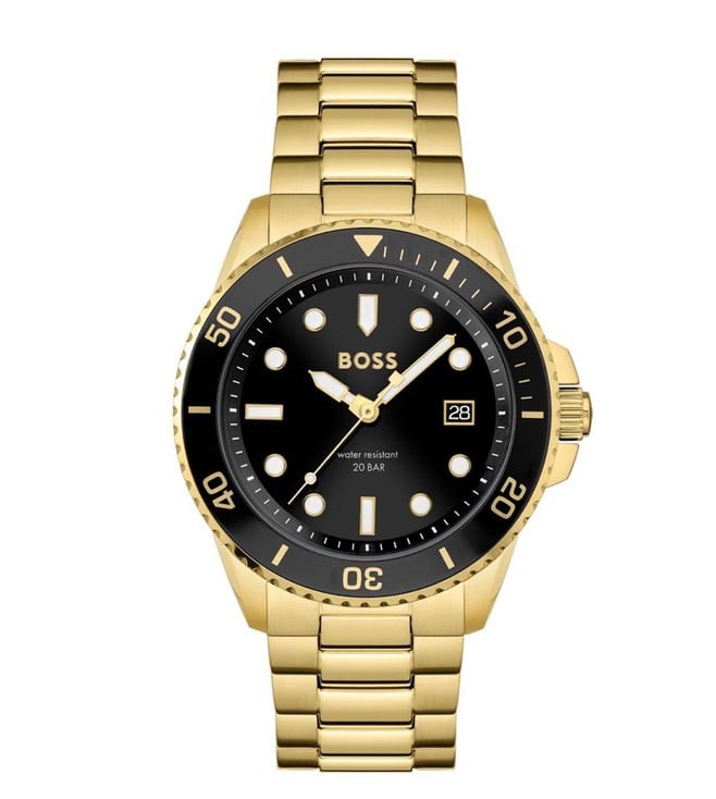 Dive deeper with the Boss Ace, a three-hand, watch with date function and water resistance. This striking diver's watch features a unidirectional rotating bezel and applied luminescent indexes in a variety of different shapes. Secured with an integrated silicone strap, the Ace is the number one choice for any man daring enough to make waves.