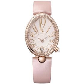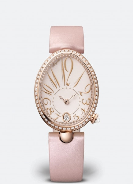 Reine de Naples wristwatch in 18-carat gold. Bezel, dial flange and crown set with 118 diamonds, approx. 1.15ct. Off-centred chapter ring with Breguet Arabic numerals. Self-winding movement. Balance spring, lever and escape wheel in silicon. Sapphire caseback. Water-resistant to 3 bar (30m). Dimensions: 36.5 x 28.45mm.