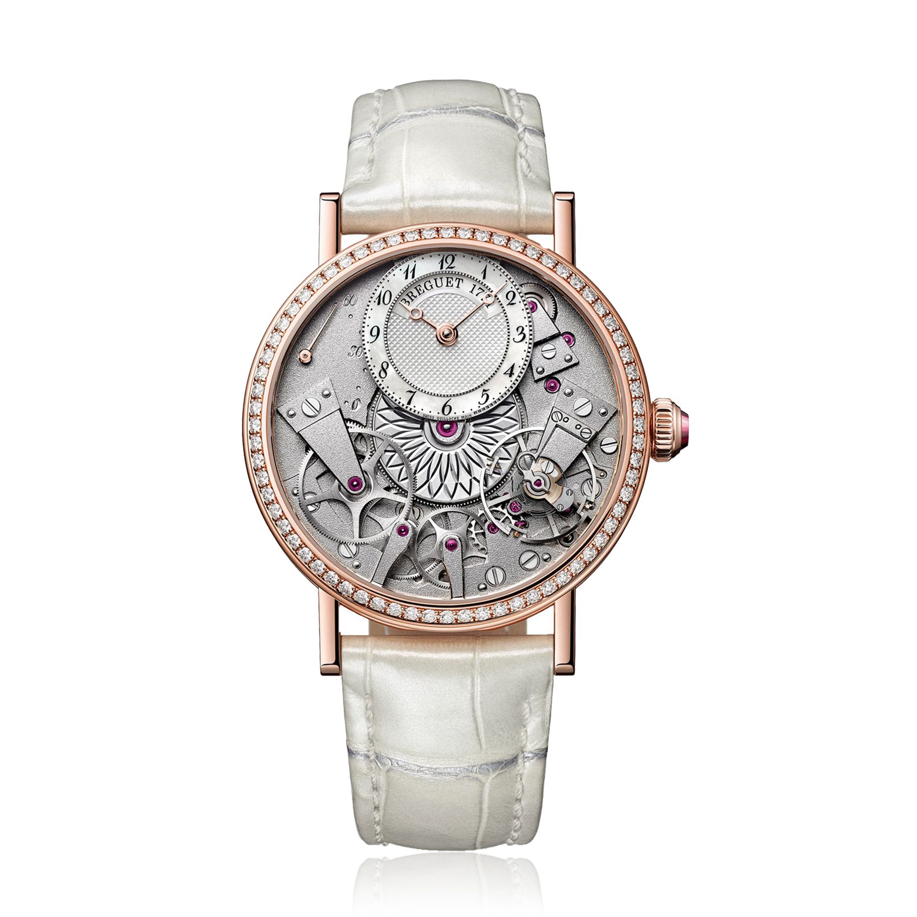 The Breguet Traditional Dame 7038 timepiece is presented on a white alligator leather strap with 18carat rose gold pin and buckle fastening. The 37mm 18carat rose gold case features a diamond encrusted bezel and open dial showcasing the self-winding automatic movement with a power reserve of 50 hours. This timepiece is water resistant upto 30m.