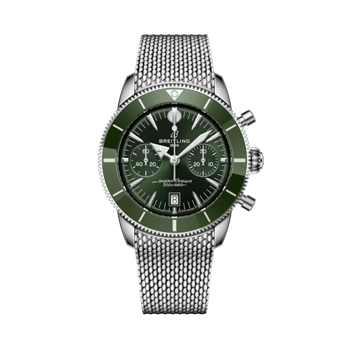 Made to move between the waves and the waterfront. The Superocean Heritage is no ordinary sea watch—it never was. When Breitling first launched it in 1957, it took a different tack from other dive watches of the era. The Ref. 1004 (a sleek time-only piece) and Ref. 807 (the world’s first dedicated dive chronograph) weren’t just about exploring the underwater world—they were about looking good doing it. The spear-and-arrow hands, ceramic rotating bezel, and naturally sleek proportions made it a favorite of stylish adventurers who lived for the sea and the scene. Today, that philosophy is still at the core of the Superocean Heritage. It’s got the soul of the 1950s, but designed for today. The latest Superocean Heritage builds on everything that made the original distinctive—and sharpens it. The chronograph is powered by the Breitling Manufacture Caliber 01, Breitling’s industry-leading timekeeping movement. A ceramic-inlayed bezel adds exceptional scratch resistance, while integrated mesh-metal or mesh-rubber bracelets fit snugly against the case, secured with folding clasps for a clean, watertight finish. Tone-on-tone subdials, a discreet date window at six o’clock, and the original signature hands—arrow for hours, spear for minutes—ensure legibility and balance, above or below the surface.