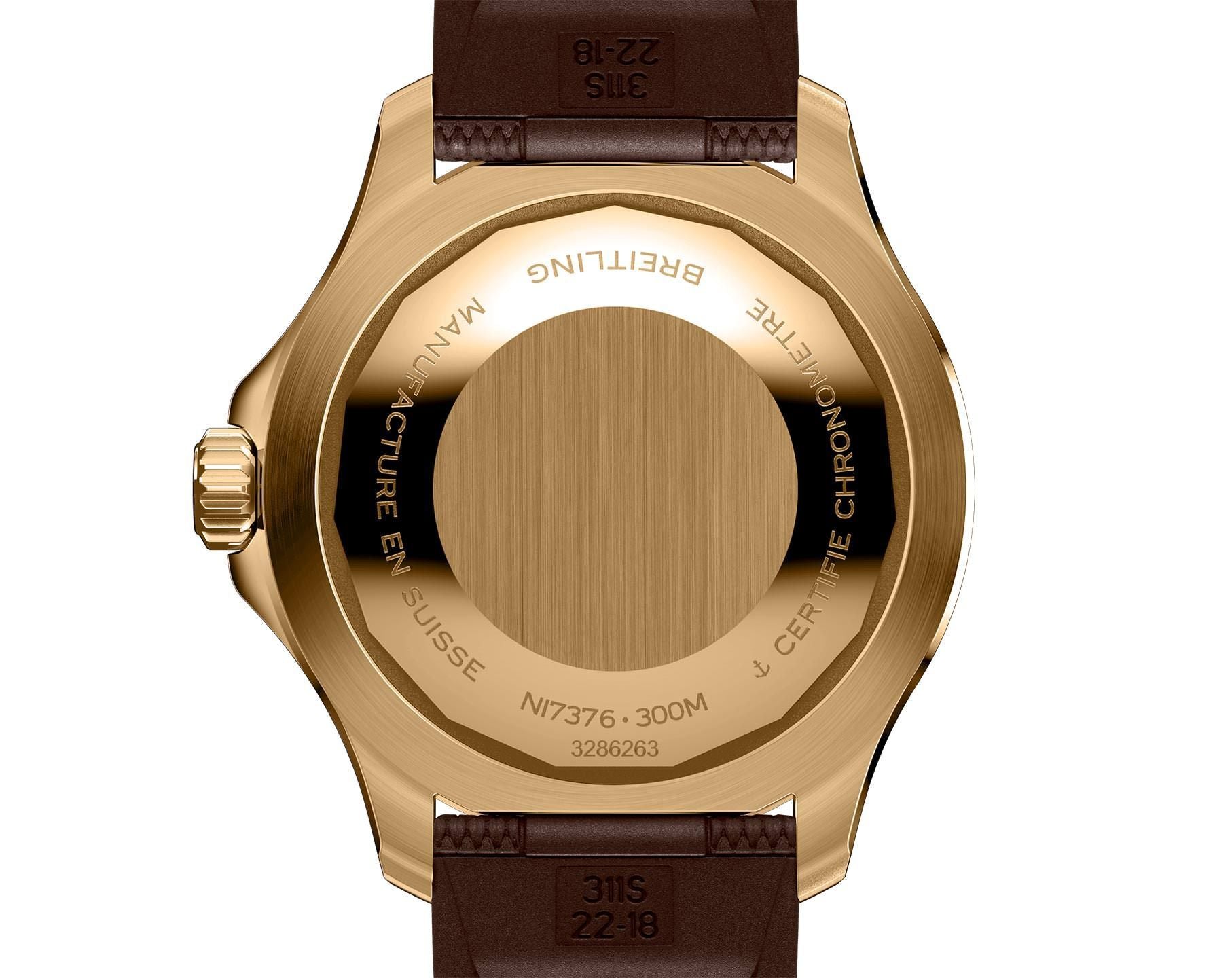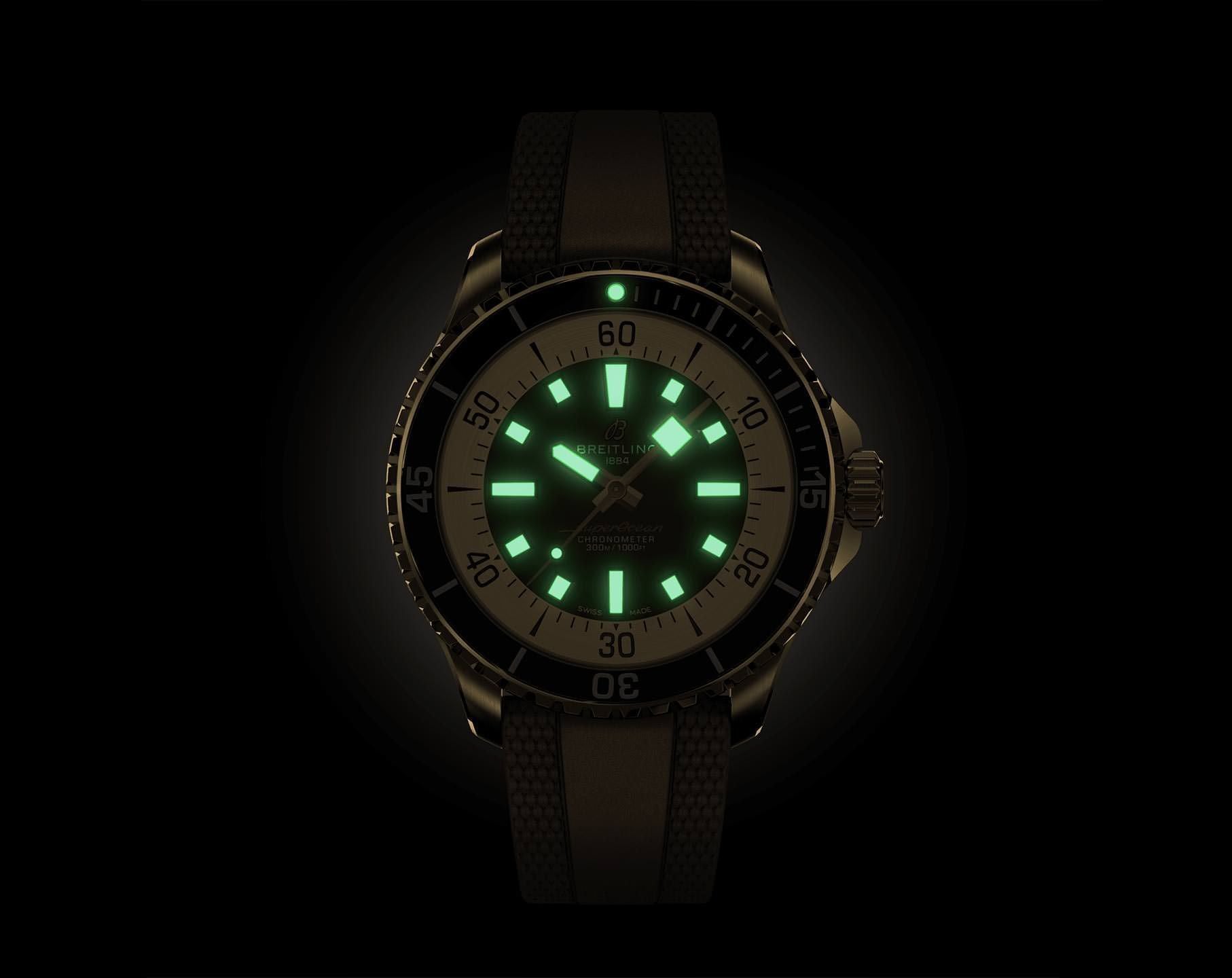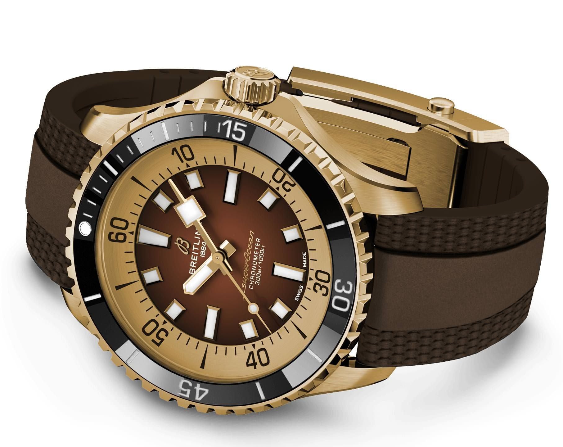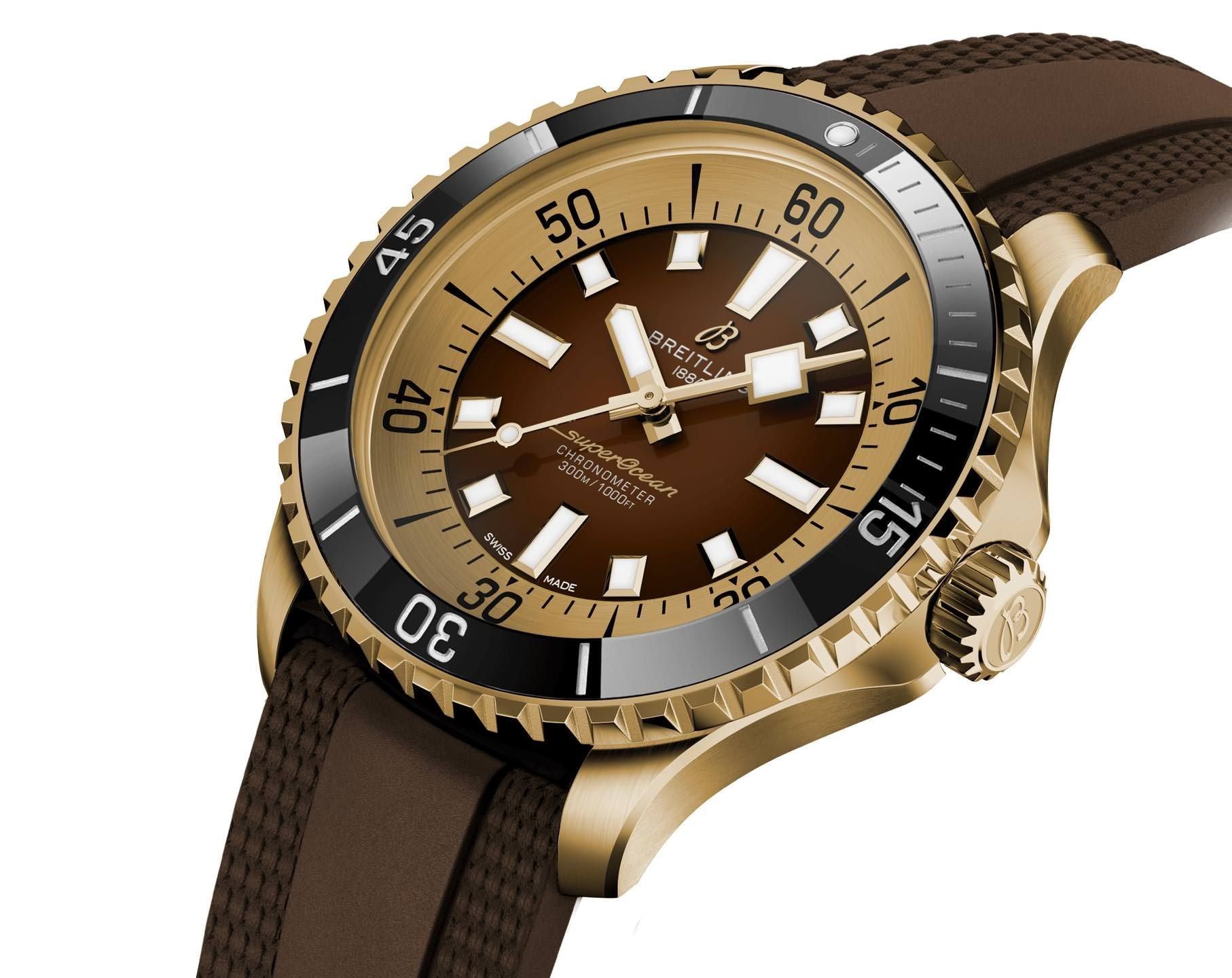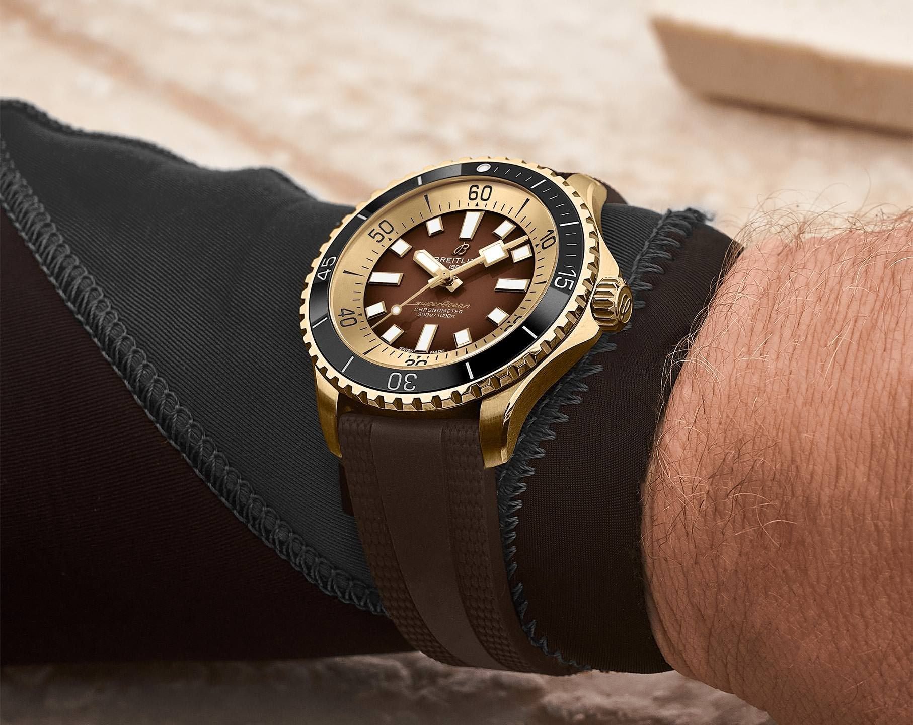 Performance and style for all your water-based pursuits. In the 1960s, the new sport of scuba diving was all the rage. For divers, timing was everything, and Breitling set out to give them the most clear-cut dive watch possible by eliminating any feature that didn’t support their lifesaving needs underwater. This pared-down watch was named the Slow Motion. What remained were clean lines, chunky luminescent indexes, squared-off hands and a high-contrast dial ring, all aimed at maximum legibility. Practical, yes. But what people really fell in love with was the look. The new Superocean retraces the Slow Motion's celebrated design codes, while adding modern features, like a ceramic-inlayed bezel and brightly colored dials. Broad hands and indexes in luminescent Super-LumiNova® allow for easy readability underwater. The watch is water resistant to 300 m (1000 ft), as well as being shock-, sand- and saltwater-resistant. The bronze version uses a special alloy that has excellent resistance to corrosion, yet will still develop a subtle patina over time that makes the watch even more unique. The two strap options (rubber and metal bracelet) have a folding clasp that allows for micro-adjustments of up to 15 mm for easy wear over rashies and wetsuits. Its scratch-proof ceramic inlayed bezel will never wear or fade. For safety, the bezel is uni-directional on most sizes and bi-directional with a patented lock on the 46 mm. Best of all, this is no longer strictly a dive watch—surf with it, swim with it, hit the beach bar with it, then wear it out to dinner. The Superocean perfectly balances the nostalgia of its heritage with a fresh new look.