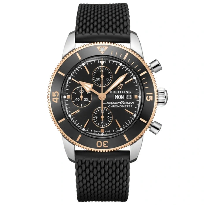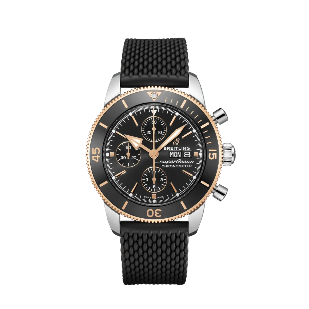 Inspired by the original Superocean from the 1950s, the Superocean Heritage combines iconic design features with a modern touch. Sporty and elegant, the Superocean Heritage is a true embodiment of style at sea. Featuring the iconic triangular-shaped hands as well as a unidirectional bezel with a polished ceramic ring, the Superocean Heritage is an elegant looking diver’s watch. Available in a variety of materials including stainless steel and 18k red gold, the Superocean Heritage Chronograph 44 features a range of colored dials. Offered either with a matching mesh bracelet, or a “mesh-styled” rubber strap fitting a folding buckle, this Superocean Heritage is powered by the Breitling Caliber 13, a COSC-certified chronometer.