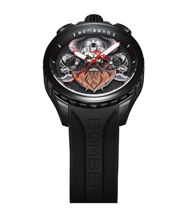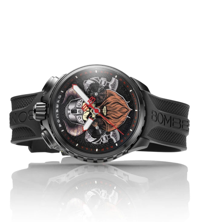 The Viking Redbeard watch dial comes alive with the runic symbols and the Valknut three triangles imagery of Norse mythology. As a tribute to Erik the Red, who also went by the name Redbeard, the Superluminova coating on the Viking's beard makes the legendary warrior-explorer come spectacularly to life as soon as darkness closes in.