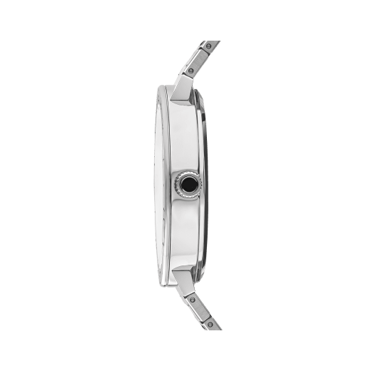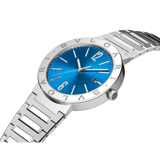 Bvlgari Bvlgari watch with mechanical manufacture movement, automatic winding and date, BVL 191 - Solotempo calibre decorated with côtes de Genève, 42-hour power reserve, 41 mm stainless steel case, blue dial, stainless steel bracelet with folding buckle and water-resistant up to 50 metres.