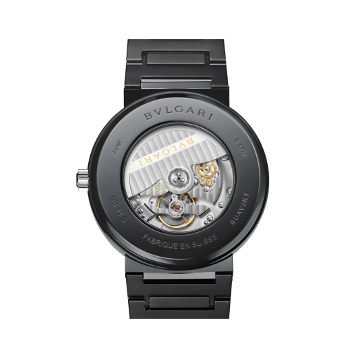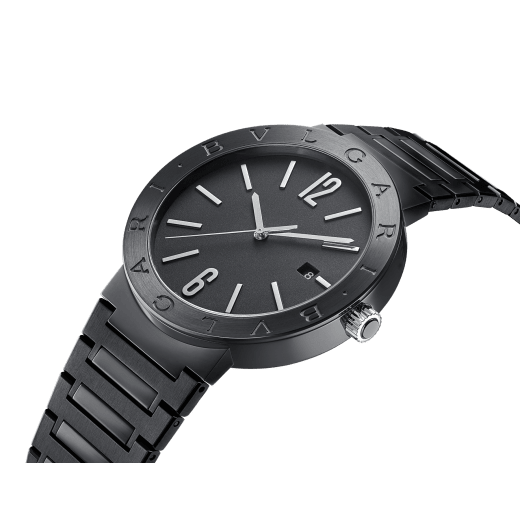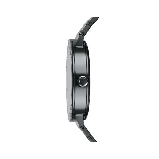 A unique fusion of unmatched Swiss watchmaking skills and the daring spirit of Italian design taking shape through an ultra-appealing monochromatic look, the BVLGARI BVLGARI watch blends timeless classiness with excellent performance. Inspired by the Roman roots of the brand, the timepiece represents an elegant fusion of culture and modernity, epitomising Bvlgari’s distinctive ability to reimagine its rich heritage into designs that go beyond trends and eras. With its ultra-appealing monochromatic look, the watch perfectly expresses the bold essence of the brand. BVLGARI BVLGARI watch with mechanical manufacture movement, automatic winding and date, BVL 191 - Solotempo calibre (3.80 mm thick), 42 hours of power reserve, 41 mm stainless steel case with Diamond Like Carbon treatment, bezel engraved with double logo, crown with black ceramic insert, black lacquered dial, stainless steel bracelet with Diamond Like Carbon Treatment and folding buckle. Water-resistant up to 50 metres.