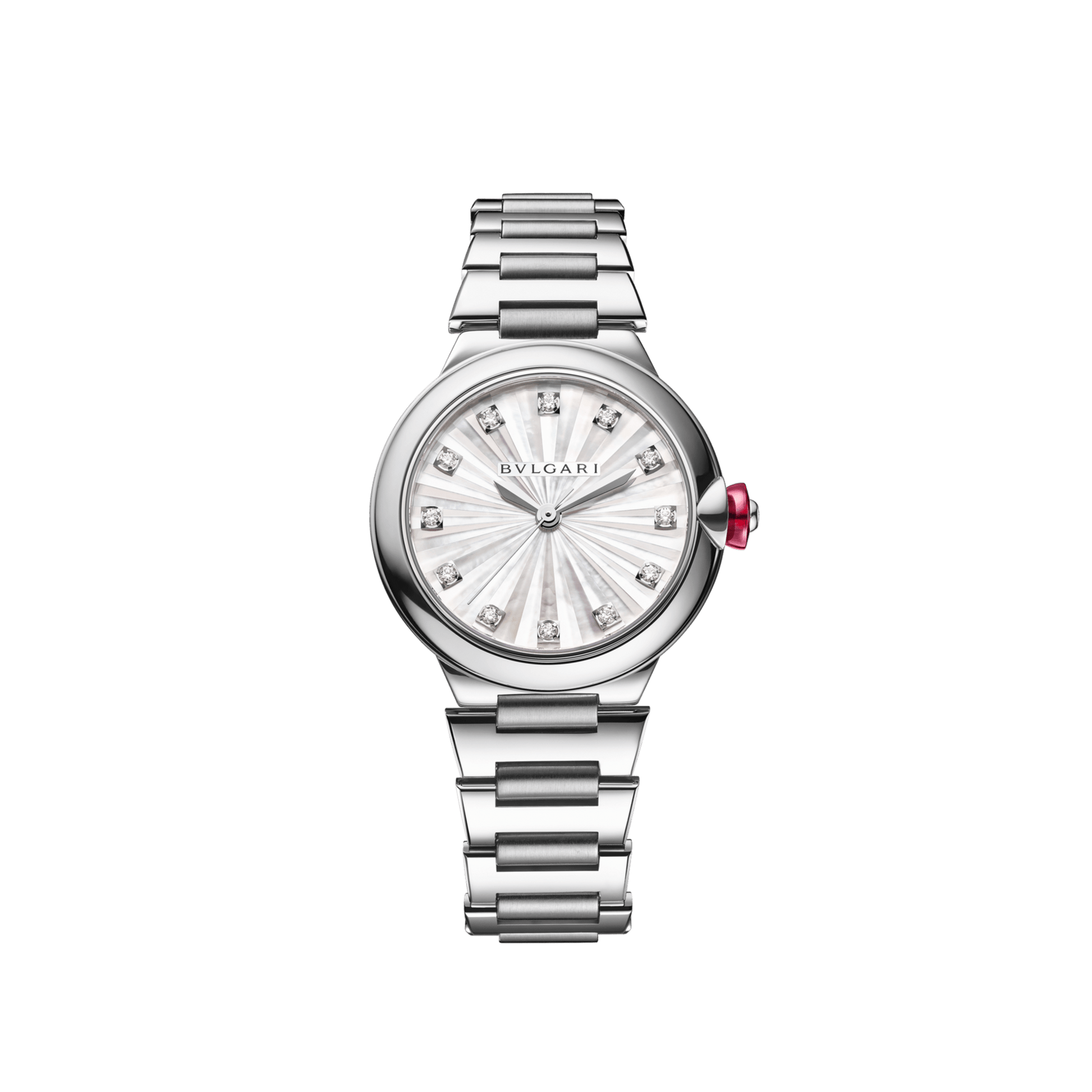 Lvcea watch with automatic movement, hours, minutes and seconds functions, 33 mm polished stainless steel case, white mother-of-pearl intarsia marquetry dial, 12 round brilliant-cut diamond indexes, stainless steel crown set with a synthetic cabochon-cut rubellite and a diamond. Polished and satin-brushed stainless steel bracelet with folding buckle. Water-resistant up to 50 metres.