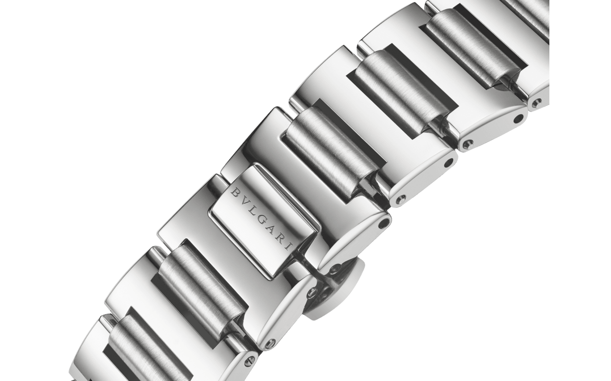 A symbol of radiant and modern femininity, the Lvcea watch brings a touch of glamour to your style and everyday life. Infused with exceptional artistry, this timepiece in polished and satin-brushed stainless steel displays the integral bond between Bulgari’s jewellery savoir-faire and watchmaking expertise. Its three-dimensional dial, embellished with diamond indexes, is crafted with white mother-of-pearl elements, faceted and assembled one by one to evoke the rays of the sun, using a classic métiers d’art technique inspired by “intarsia”.