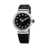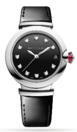 Enlightening time, LVCEA brings glamor to the everyday and to every style: it is a watch truly made for women. Inspired by the timeless beauty of Rome with its unflinching symmetry and purity of lines, the LVCEA timepiece blends classic flair with contemporary look, whilst its bold and rigorous design and ultra-sophisticated total-black look is combined with a delicate use of diamond accents, as a celebration of light itself. LVCEA Mechanical watch movement automatic winding B77 calibre with date with automatic winding. 33 mm polished steel case. Steel crown set with a pink cabochon-cut synthetic stone, and 1 round brilliant diamond. Black lacquered dial set with 12 diamonds indexes 0.19 ct. Black varnished calf strap with steel pin buckle.