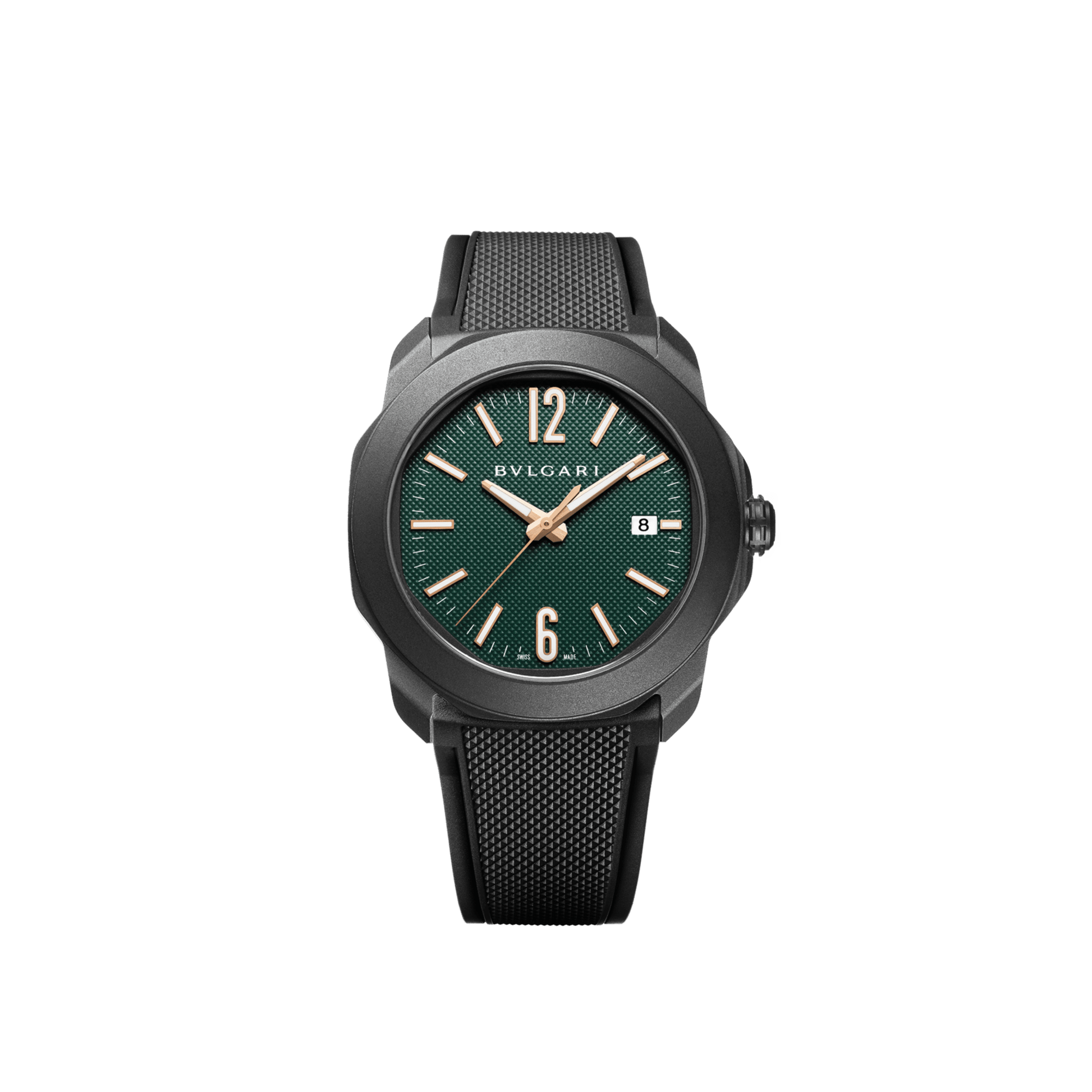 Octo Roma watch with mechanical manufacture movement, automatic winding, DLC coated stainless steel case, green Clous de Paris dial and black rubber bracelet. Additional interchangeable green rubber strap. Water-resistant up to 100 metres. Special Edition exclusive to Middle East.