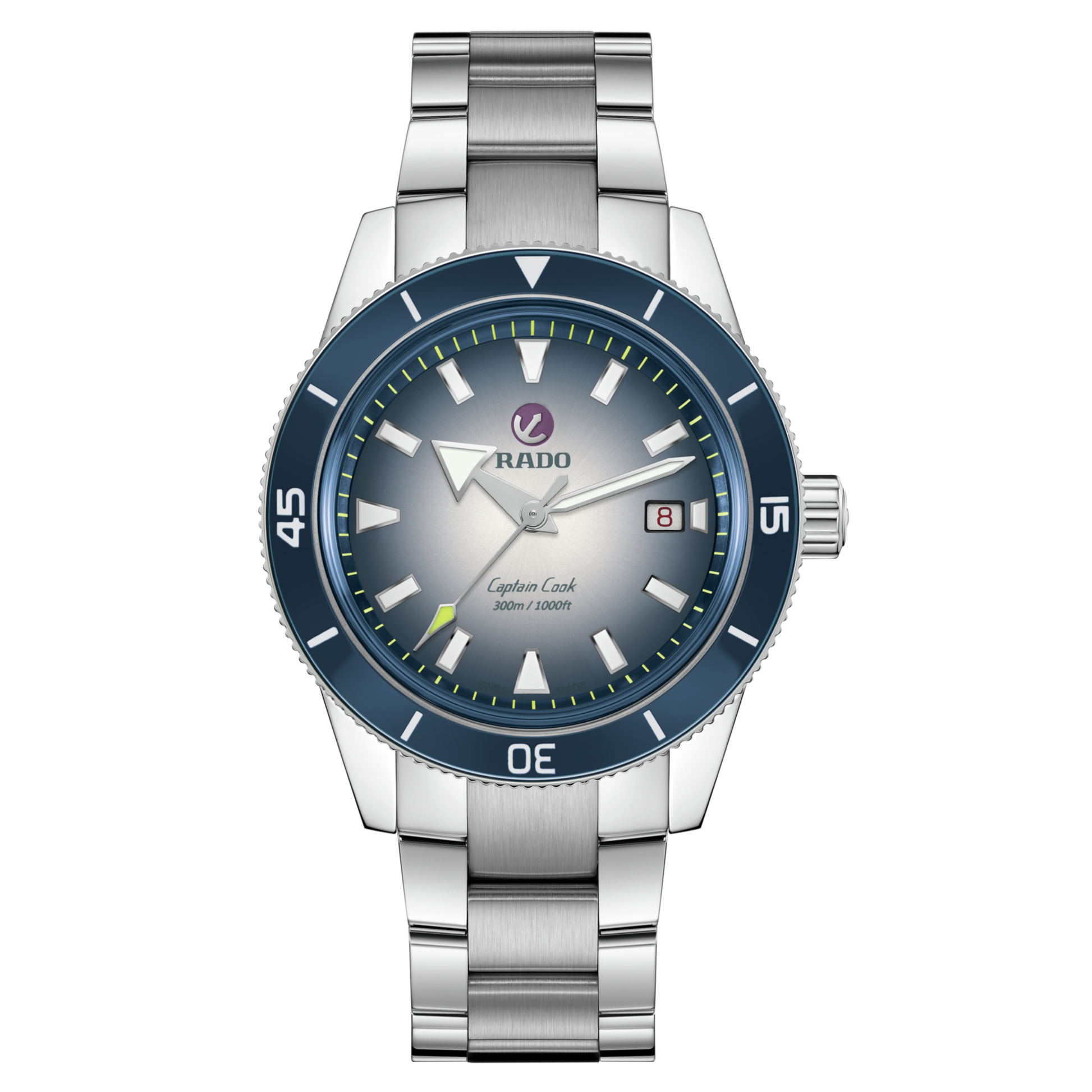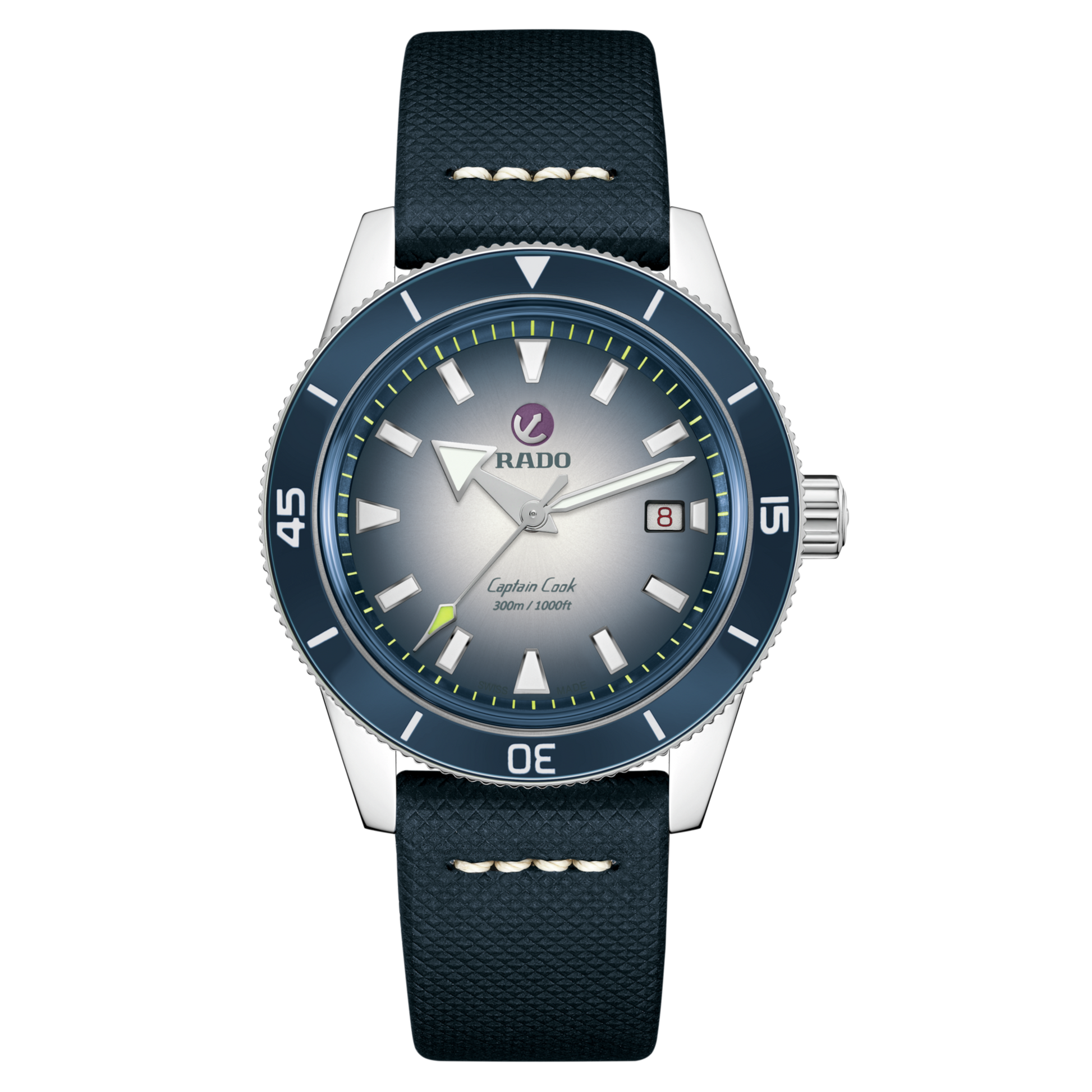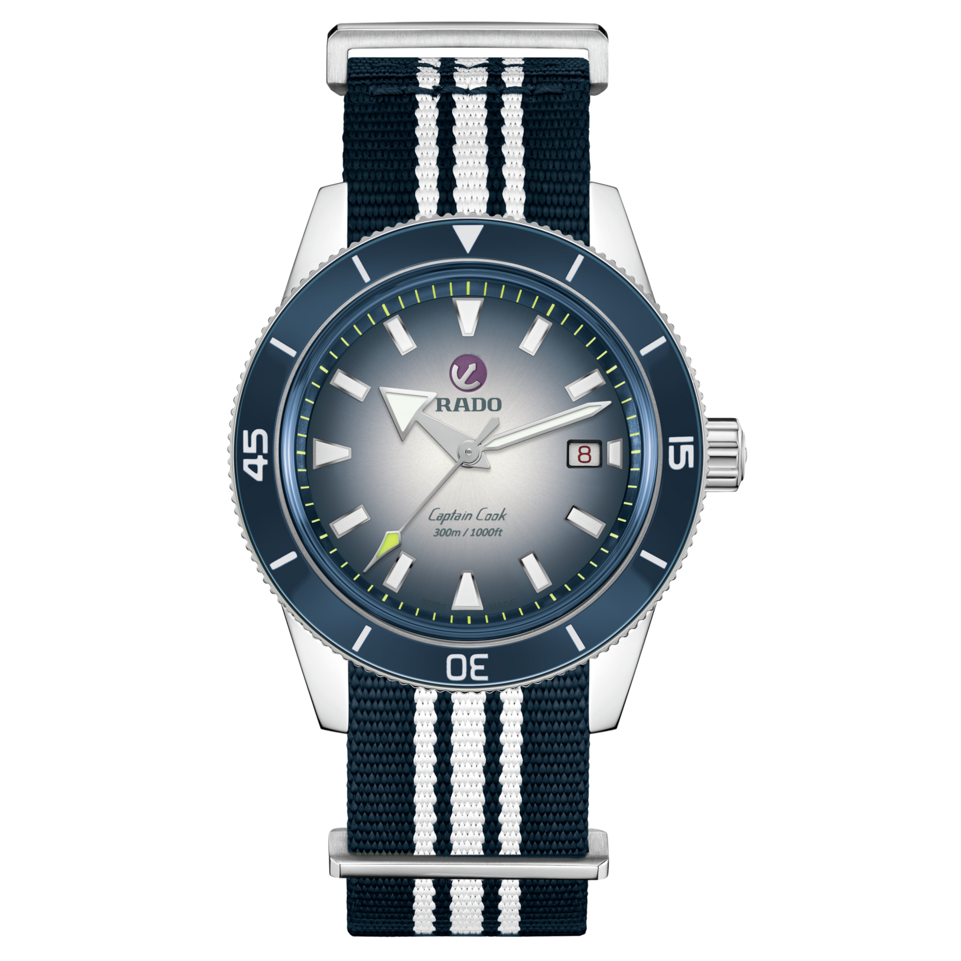 The Captain Cook Automatic features a 42mm polished stainless-steel case and crown. On top, a polished stainless steel rotating bezel with a polished blue high-tech ceramic bezel insert with engraved numbers and markers in matt white Super-LumiNova®. Powering this watch is a Rado calibre R763, an automatic movement that delivers an impressive 80-hour power reserve. The rhodium coloured hour and minute hands are treated with white Super-LumiNova® and the tip of the central seconds hand is treated in yellow Super-LumiNova®, a playful nod to the colour of tennis balls. The Captain Cook Automatic watch is delivered with a stainless steel bracelet and a blue leather pouch. A pair of strap options is available including a classic blue leather strap or a blue and white NATO-style textile strap.