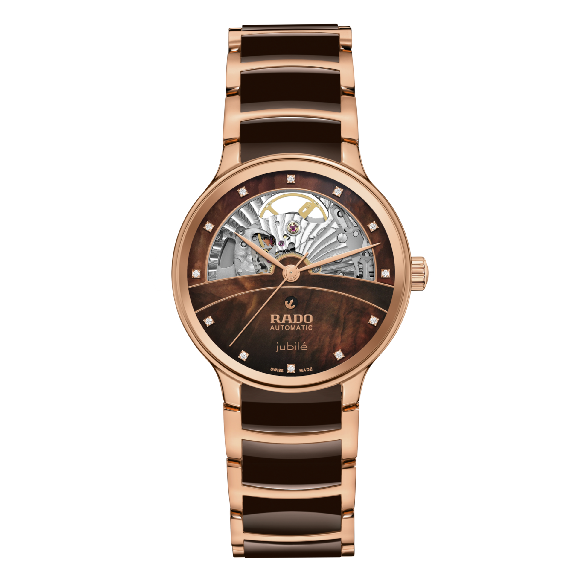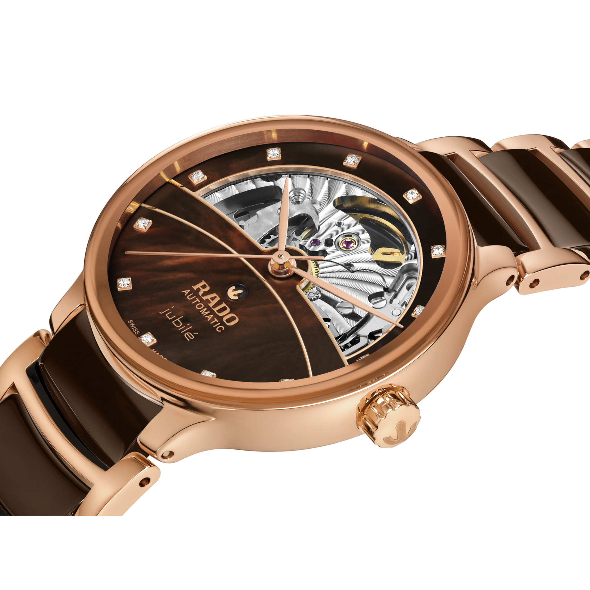 Experience the harmonious blend of artistic expression and design stylings with the Rado Centrix Open Heart watch. As the constellations write their eternal stories above our heads, they build bridges for lovers to meet. A large window, reminiscent at once of dawn and dusk, beautifully frames a state-of-the-art R734 automatic movement with 80 hours of power reserve and an antimagnetic NivachronTM hairspring, as well as a deeply elegant rippled-sunlight "ondulé soleil" motif on chosen component surfaces. The overall appearance of this iconic timepiece is completed with adjusted case lugs and a bracelet made of polished rose-gold-coloured PVD-coated stainless steel with brown high-tech ceramic middle links. The dark brown mother-of-pearl dial with 12 diamonds, emphasised with the rose gold coloured printed “jubilé” logo, matches perfectly with the hands. The watch is water resistant down to 50 m and is also available in L size.