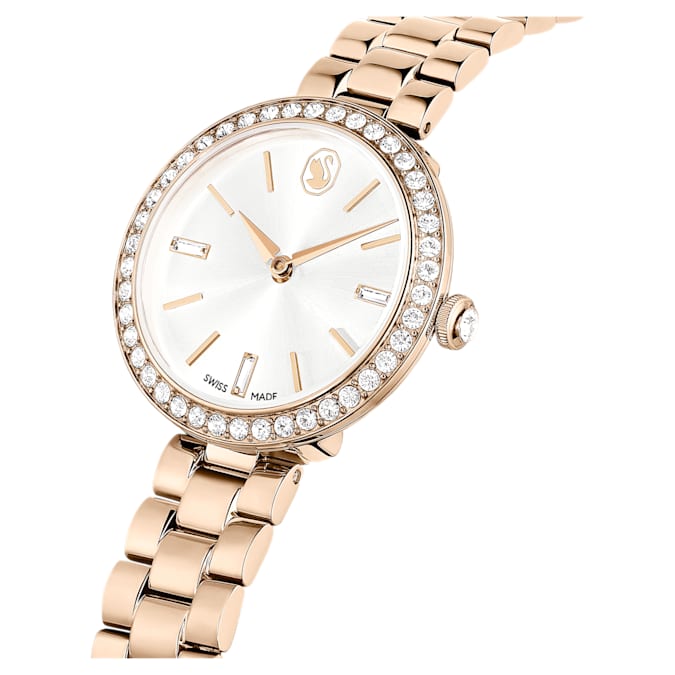 Blending Swarovski radiance with contemporary design, this Certa watch is the perfect fusion of artistry and functionality. The 30mm stainless steel case has a warm champagne gold-tone finish and a bezel set with a shimmering pavé of 42 crystals. On the radiant sunray dial, there is an elegant swan logo at 12 o’clock, along with three index markers crafted from individual baguette-cut crystals. A single crystal is set within the crown, while the three-link metal bracelet provides a comfortable fit around the wrist. This Swiss made watch is water resistant to 50 meters and is an elegant choice to complement your everyday style.