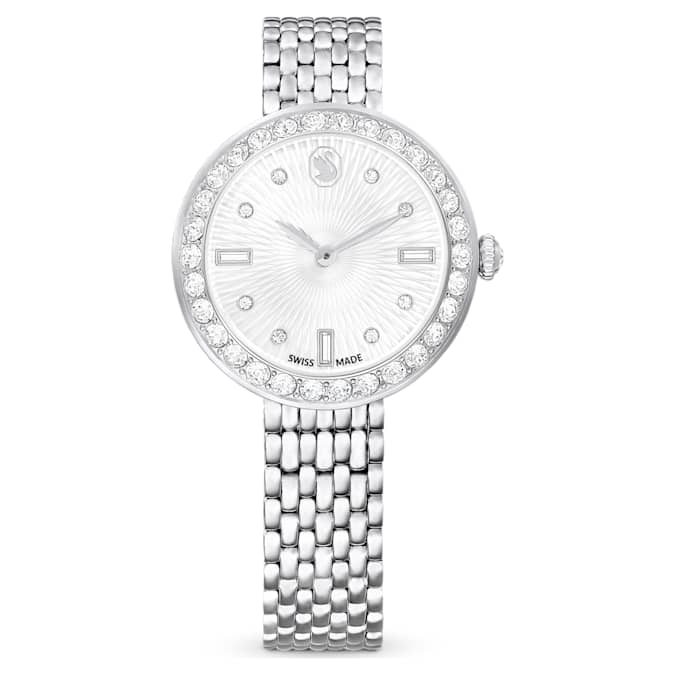This Certa watch is creatively crafted to accentuate any outfit. The round 30mm case is made in stainless steel and features a bezel set with a pavé of 30 crystals. Beneath the mineral glass, a mesmerizing guilloché dial is revealed, with the Swarovski swan logo at 12 o’clock, along with indexes created from round and baguette crystals. There is also a single crystal set in the watch’s crown. For style around the wrist, the watch is presented on a seven-link bracelet in stainless steel. This Swiss made watch is water resistant to 50m and is designed to keep you on time for everyday occasions with exquisite sophistication.