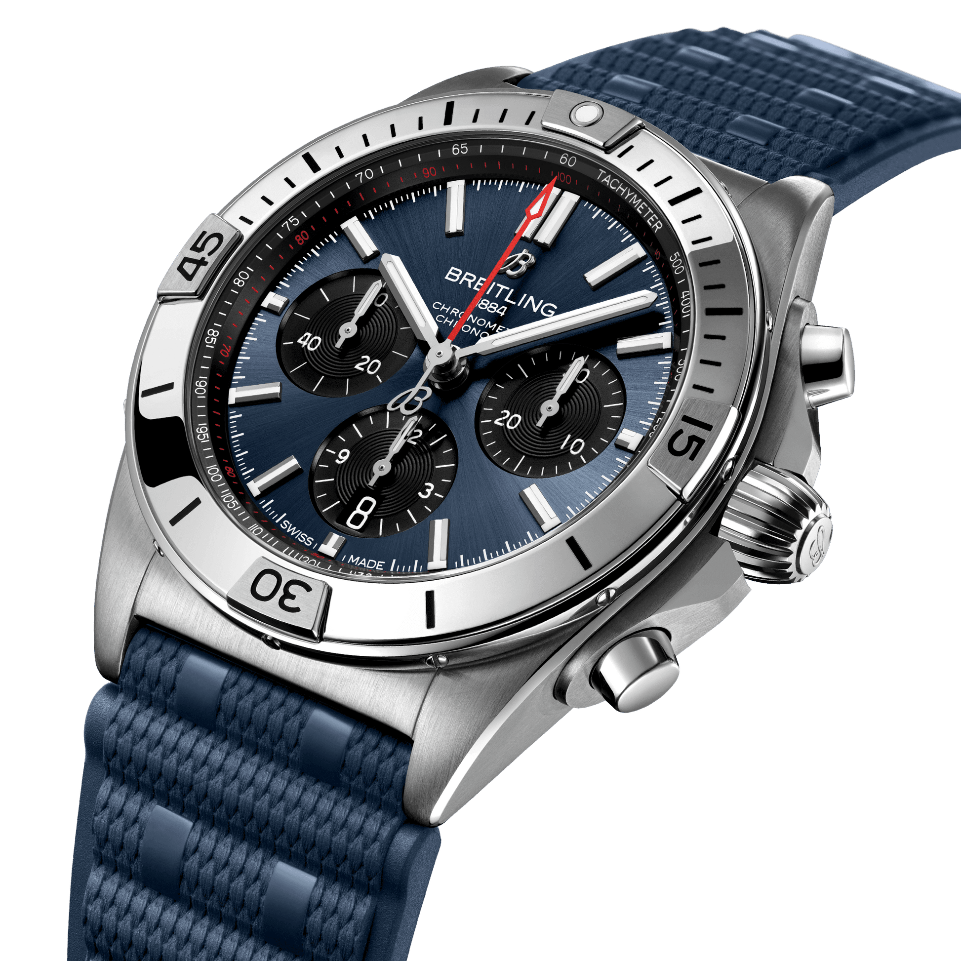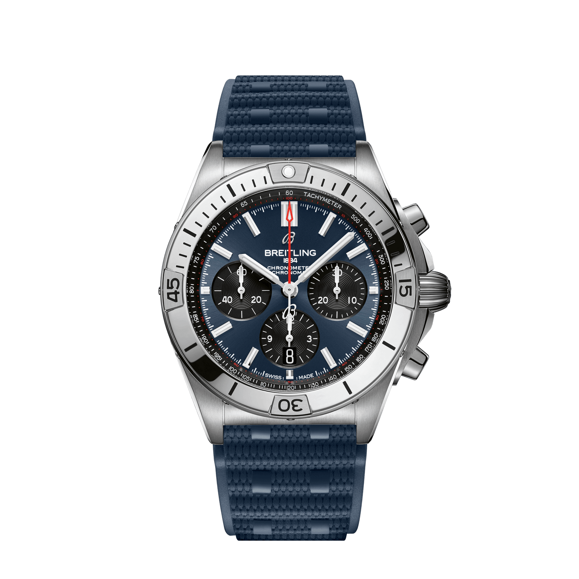 Breitling’s all-purpose watch for your every pursuit. The Chronomat holds a significant place in Breitling’s history. Introduced in 1984, at a time where extra-thin quartz timepieces were the order of the day, Breitling placed a bold bet on an impressively proportioned mechanical watch. Based on the Frecce Tricolori chronograph, which had been developed and launched in 1983 in collaboration with the famed Italian aerial squadron, the Chronomat celebrated Breitling’s centenary in style and marked the return of the mechanical chronograph to its rightfully prominent place at the brand which had built its global reputation on these incredible watches. Available in a variety of materials from stainless steel to luxurious 18 k red gold, the Chronomat features a 42 mm case and the iconic bezel with the four rider tabs. Available in a range of colorful dials, the Chronomat is matched to the signature “Rouleaux” bracelet in metal or rubber and is powered by the in-house Breitling Manufacture Caliber 01, a COSC-certified chronometer.