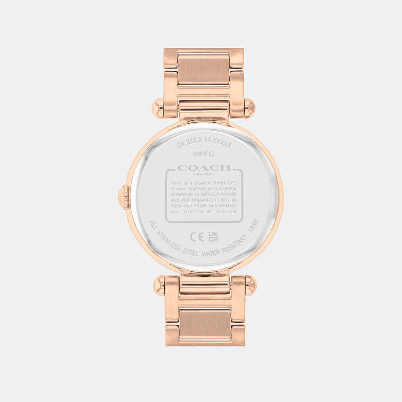 Accessorize your wrist with this women's analog watch from the Cary collection by Coach and make a style statement. Operated by a quartz movement and safeguarded by a mineral glass, the pink round dial is encased in a 34 mm case. It features plain two hands. The stainless steel strap vaunts a rose gold hue that enhances the look of the watch. Moreover, it is fitted with a clasp that ensures a secure fit on the wrist.