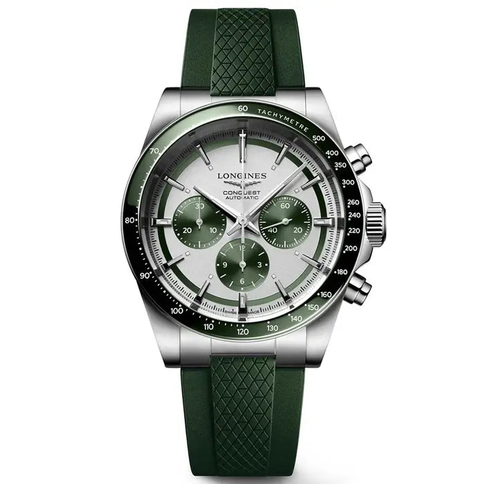- Housed in a 42mm stainless steel case with a green rubber strap