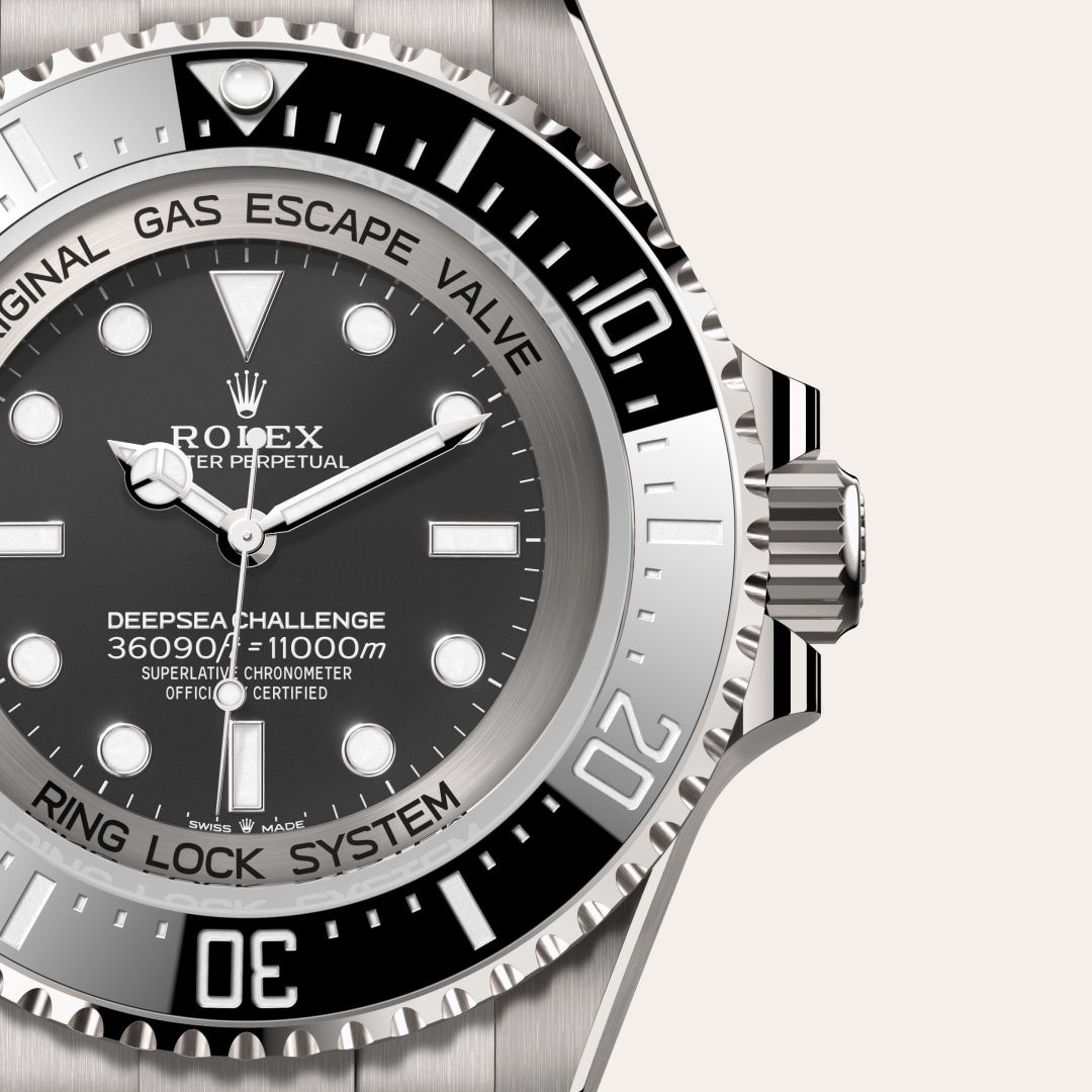 The 60-minute graduated, unidirectional rotatable bezel of the Rolex Deepsea enables divers to precisely and safely monitor their dive and decompression times. It is equipped with a patented black Cerachrom bezel insert manufactured by Rolex in a virtually scratchproof ceramic whose colour is unaffected by ultraviolet rays. The graduation is coated via PVD (Physical Vapour Deposition) with a thin layer of platinum. The dial features large Chromalight hour markers and hands, filled with luminescent material that emits a long-lasting blue glow for excellent legibility in dark conditions.