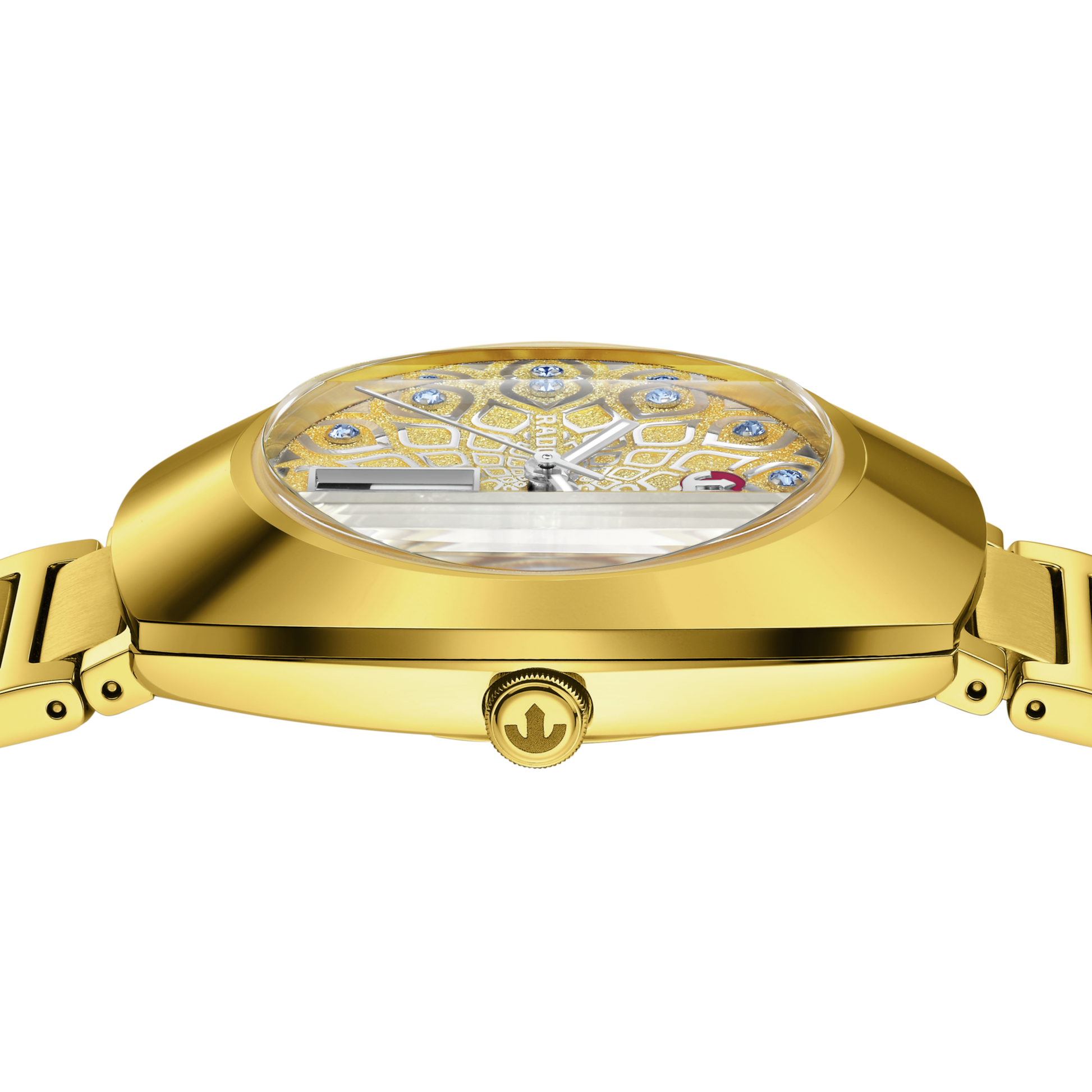 The unique DiaStar Original has a diameter of 38 mm and is water resistant down to 100 m. Framed by an ultra-shiny yellow gold couloured Ceramos™ coiffe with polished angles and detailing set over a matching, yellow gold couloured PVD coated stainless-steel case, this beautiful watch is rounded off with a vertical faceted sapphire crystal. Specifications include rhodium coloured hands with white Super-LumiNova®, and a white day display and a black date display. The dial features eleven light blue cubic zirconia, on a rhodium coloured harmonic pattern on a diamond powder decoration. The Rado R764 automatic movement offers 80 hours of power reserve, with an antimagnetic Nivachron™ balance spring. The bracelet is made of yellow gold PVD coated polished and brushed stainless steel.