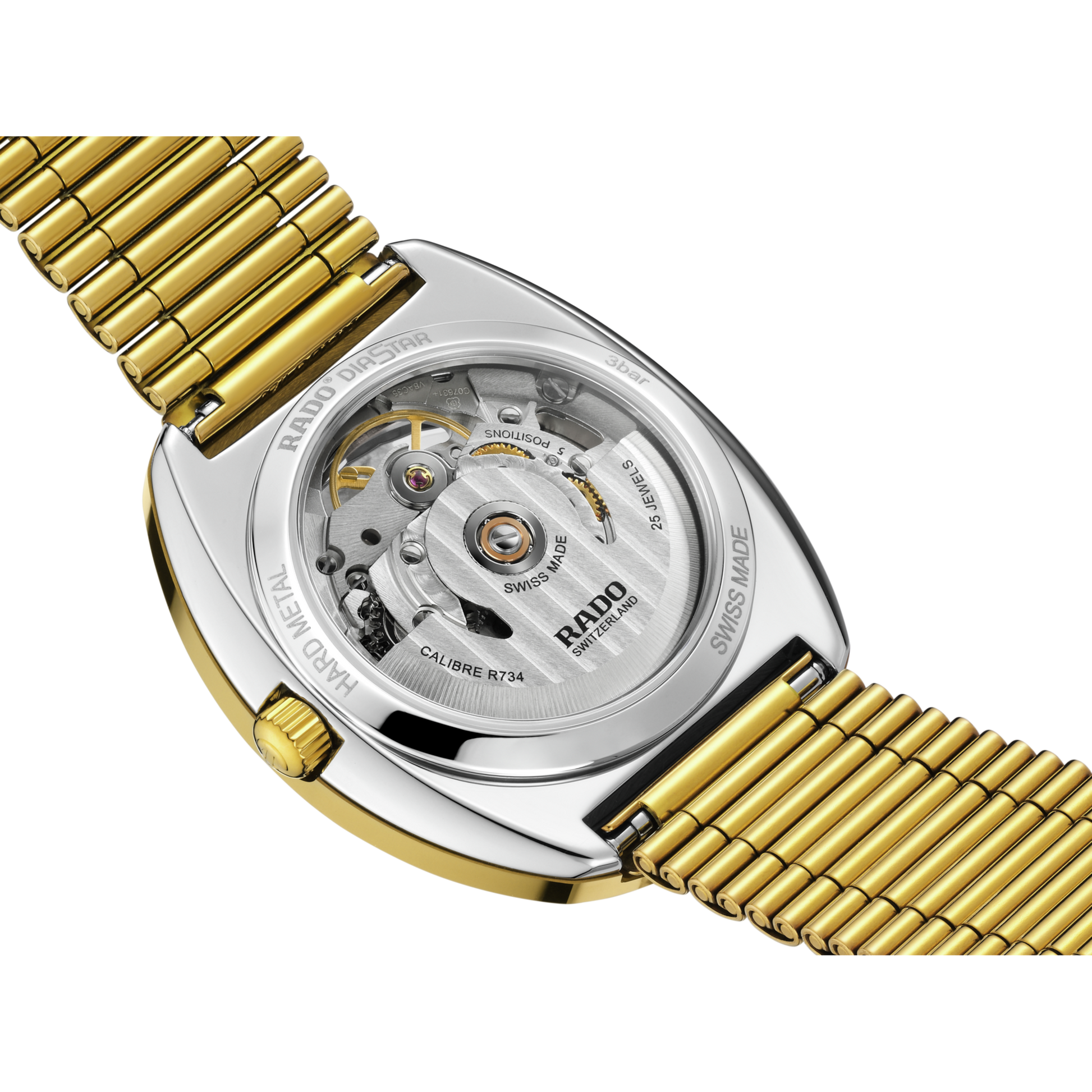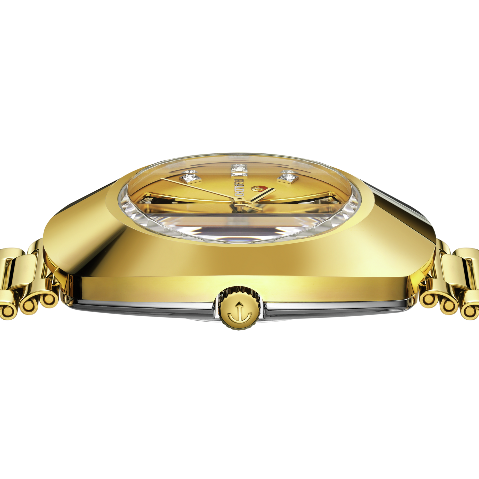 In 1962, Rado revolutionised watchmaking with its scratch-resistant DiaStar. Incorporating the bold and ageless appeal of the first DiaStar, the Original bears the features and functions Rado enthusiasts know and the distinctive look they love. The vertical faceted sapphire crystal shows the yellow open heart designed dial with 6 cubic zirconia. The open heart designed dial gives a lighter to the automatic R764 movement with 80 hours of power reserve and sunray guilloche pattern decoration.
