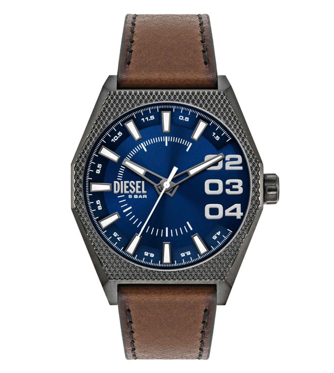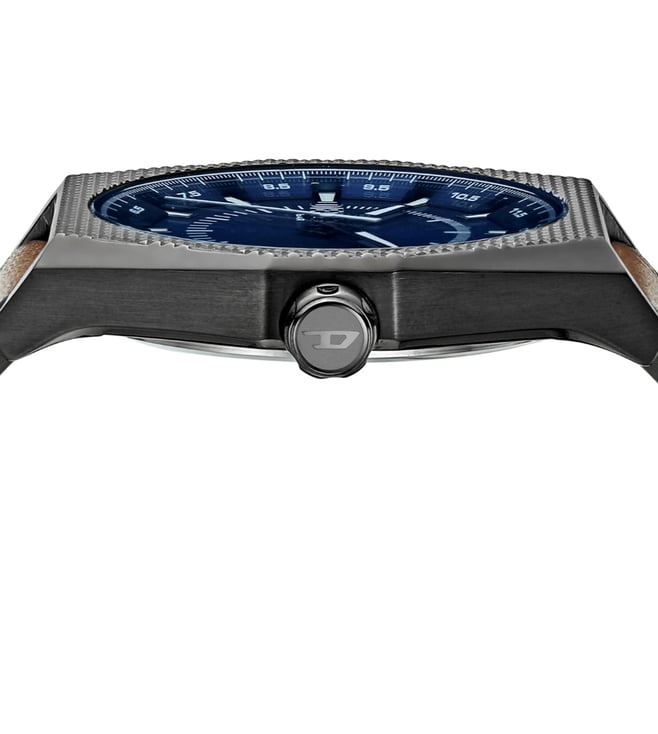 A must-have timepiece for all the watch aficionados, this men's analog watch from Diesel will be a perfect pick. The blue rectangular dial is protected by a mineral glass. It has a crown for time adjustment. The genuine leather strap comes in a brown hue that further elevates the look of the timekeeper. Besides, it is completed with a buckle clasp to ensure a secure fit on the wrist
