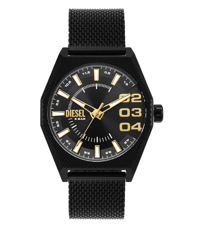 Infuse class to your attire with this men's analog watch from Diesel. The black round dial is protected by a mineral glass. It has a crown for time adjustment. The stainless steel strap comes in a black hue that further elevates the look of the timekeeper. Diesel's 43mm Scraper watch features a black sunray dial, three-hand movement and black stainless steel bracelet.