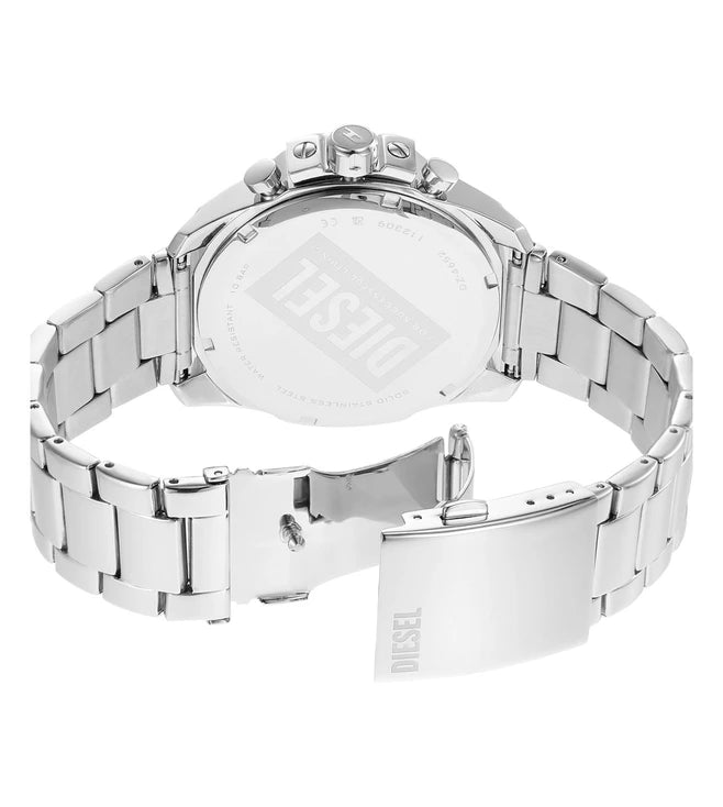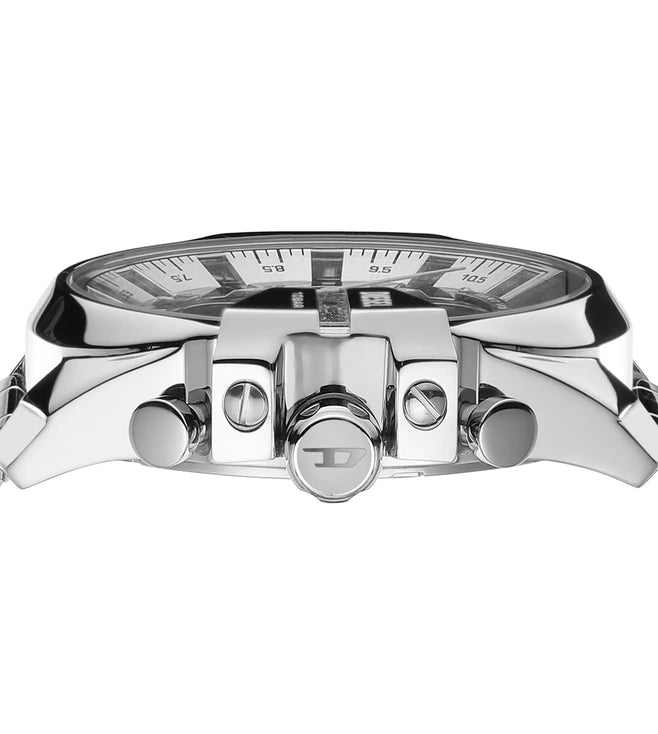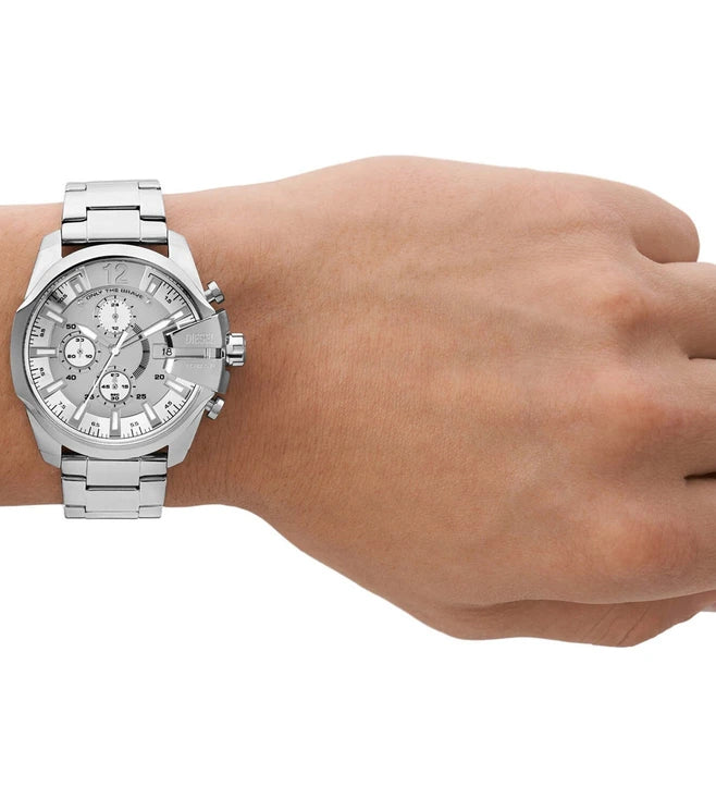 Carry great technology wrapped around your wrist with this stylish men's analog watch from Diesel. The silver round dial is protected by a mineral glass. It has a crown for time adjustment. The stainless steel strap comes in a silver hue that further elevates the look of the timekeeper. Diesel's 43mm Baby Chief watch features a silver mirror dial, chronograph movement and silver chrome stainless steel bracelet.
