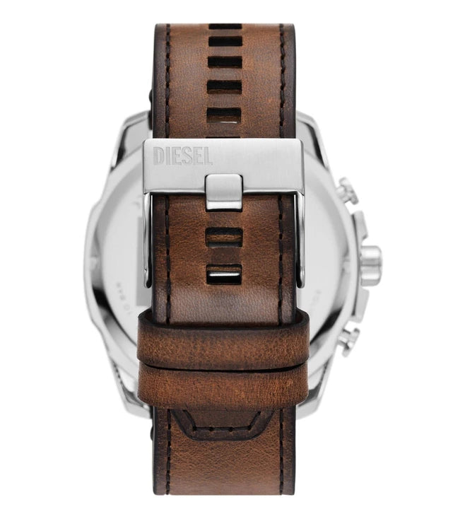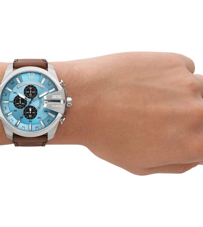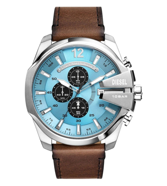 Get hold of this stylish men's analog watch from Diesel and make a distinct style statement. The blue round dial is protected by a mineral glass. It has a crown for time adjustment. The genuine leather strap comes in a brown hue that further elevates the look of the timekeeper. Diesel's 51mm Mega Chief watch features a blue sunray dial, chronograph movement and brown leather strap.