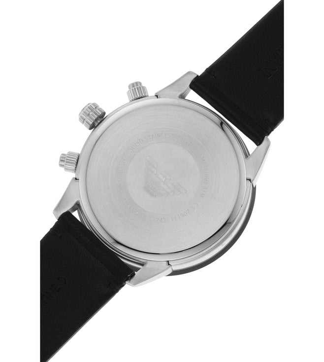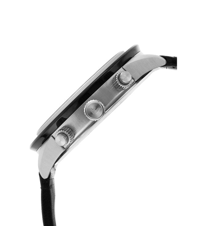 Entirely coordinated in a stately tone of black, this fine timepiece has the striking silhouette and fine dial of the Mario collection by Emporio Armani. This 43mm watch features a black dial with silver stick indexes, chronograph movement and black leather strap.