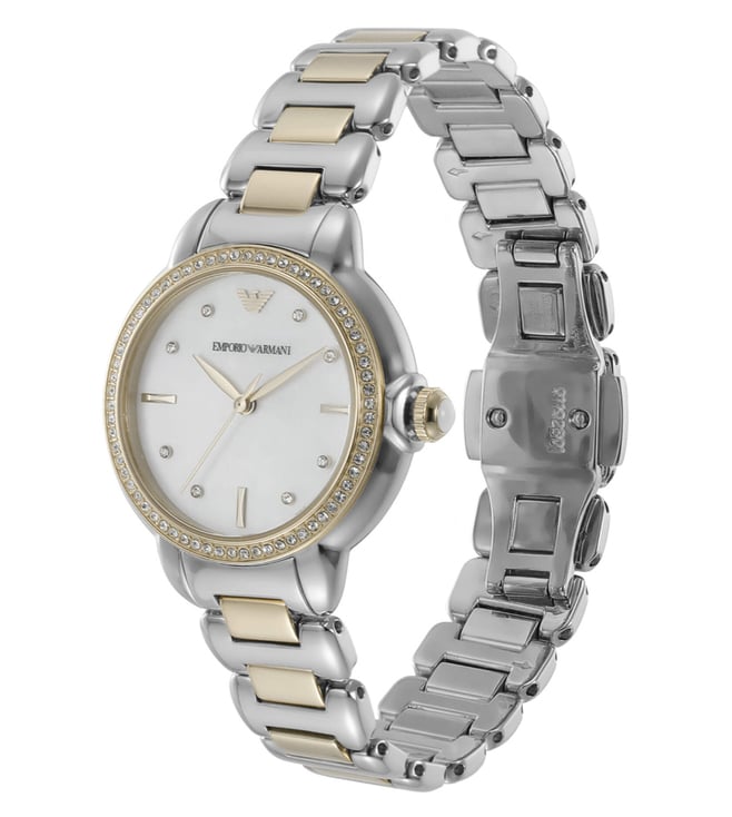 A must-have timepiece for all the watch aficionados, this women's analog watch from Emporio Armani will be a perfect pick. Emporio Armani's 32mm watch features a white mother of pearl dial, three-hand movement, at least 50% recycled stainless steel case and two-tone at least 50% recycled stainless steel bracelet. The white MOP round dial is protected by a mineral glass. The stainless steel strap comes in a two tone hue that further elevates the look of the timekeeper. Besides, it is completed with a deployment clasp with push button clasp to ensure a secure fit on the wrist.