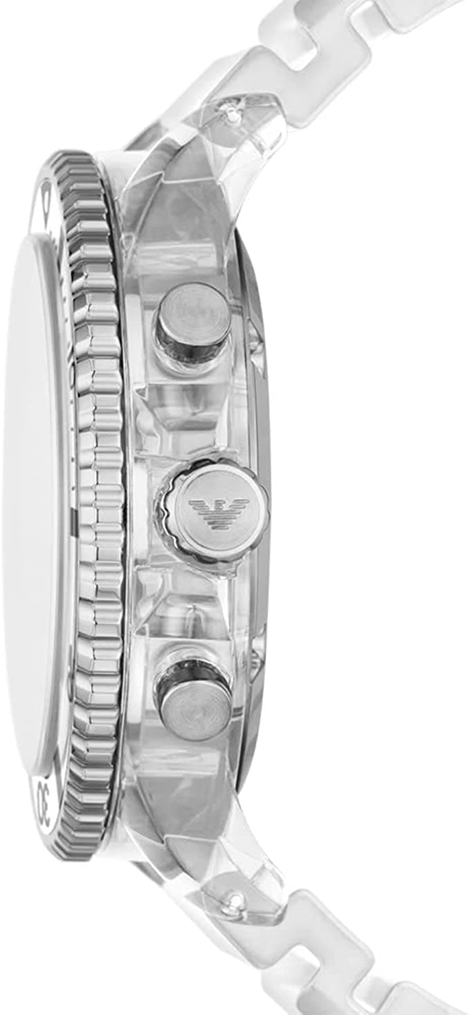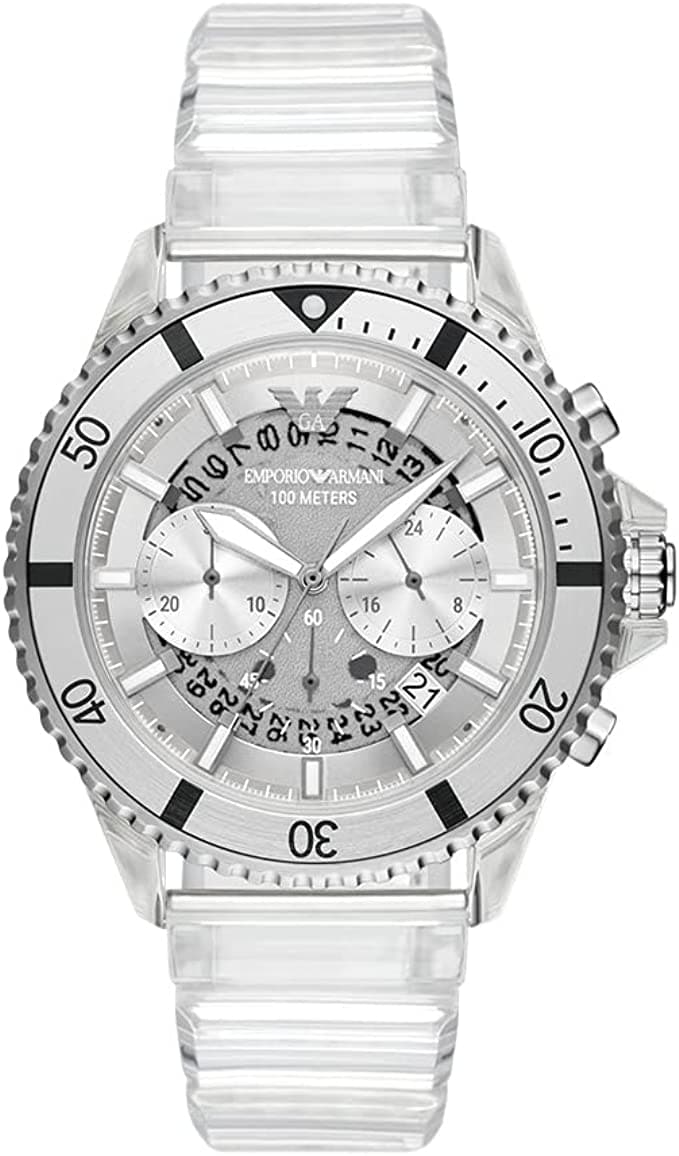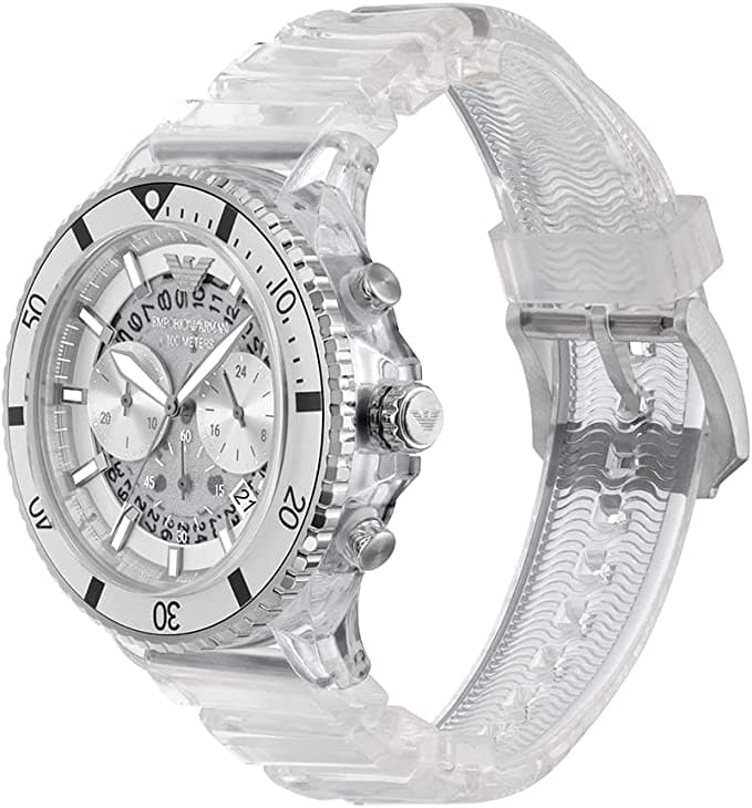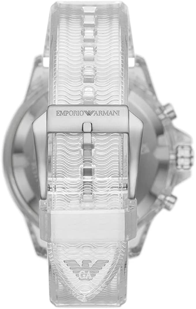 Emporio Armani's 44mm watch features a translucent semi-glossy and sunray dial with cd finishing on counters, chronograph movement, at least 50% recycled stainless steel and translucent castor oil case and translucent polyurethane strap.