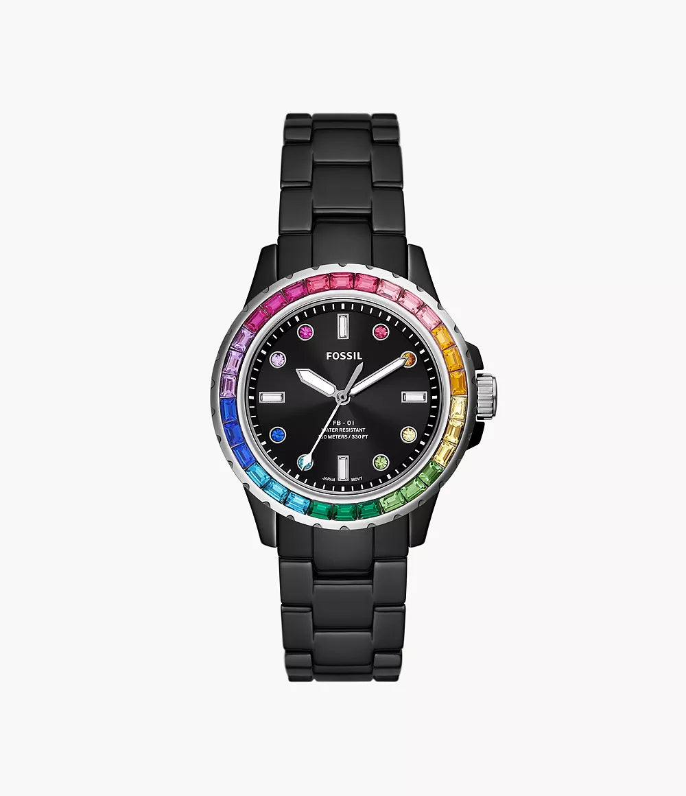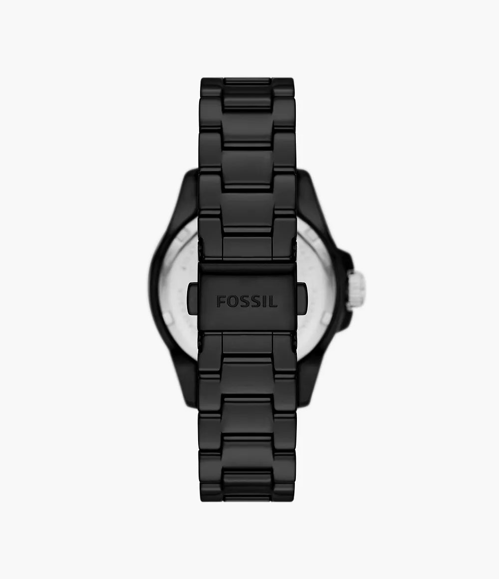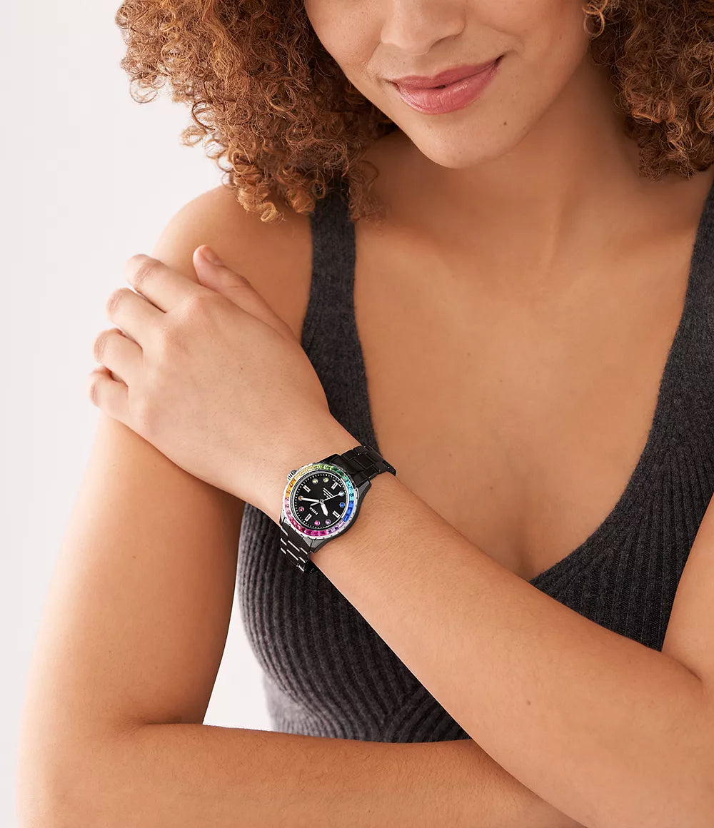 The legacy of Fossil Blue returns with this bold reinterpretation of our dive-inspired watch collection. It features a black ceramic three-link bracelet, a colourful topring and vibrant crystal indices. Ready for the season? Yes. A total statement maker? Obviously.