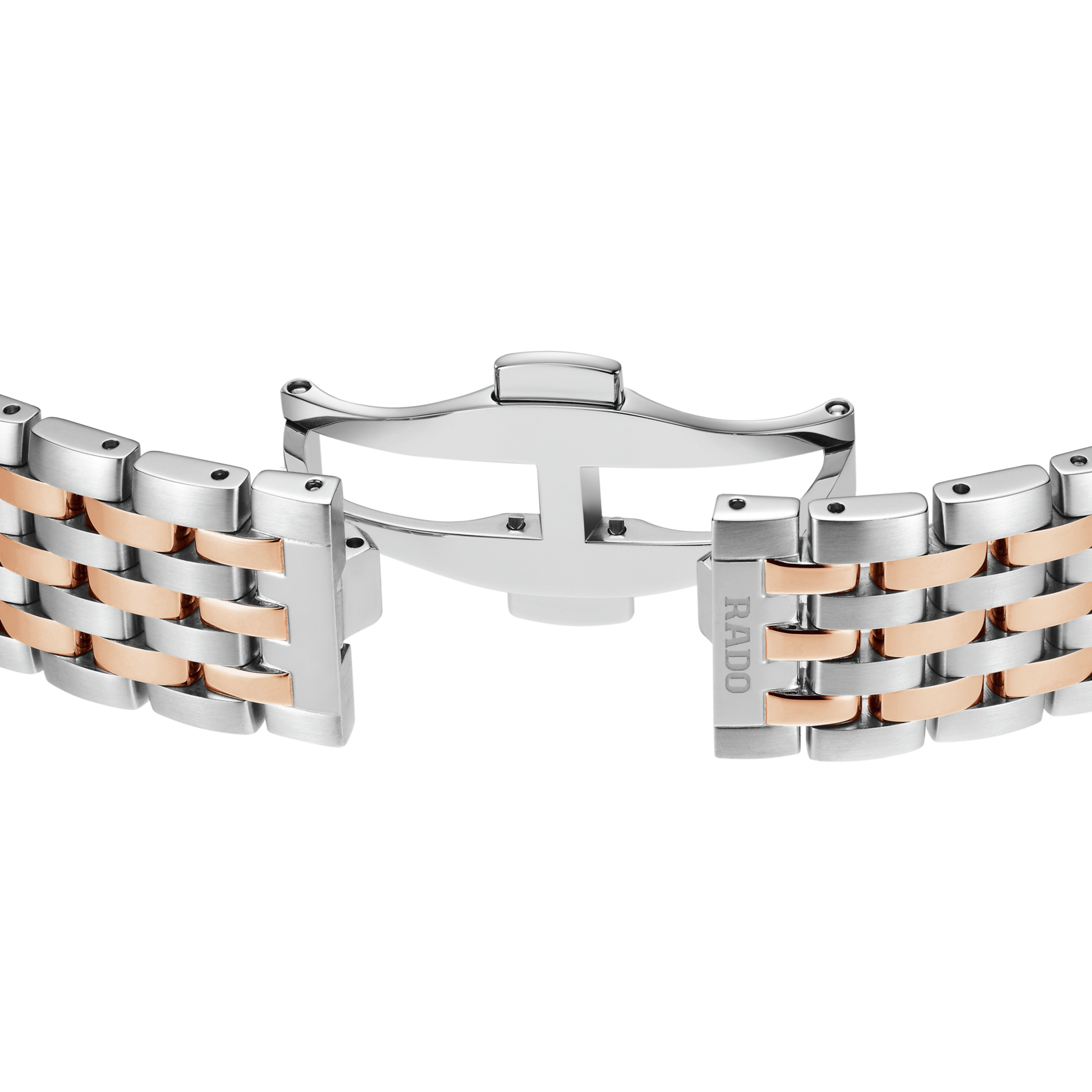 Discover the timeless blend of Swiss precision and elegance with the iconic Rado Florence. The 39 mm case is crowned with an edge-to-edge sapphire crystal, featuring a metallised edge that matches the stainless steel case. This sapphire crystal functions both as the protective front and as a bezel, seamlessly integrated into the case to enhance the Florence iconic refined profile. Serving as a theatre scene, the grey dial showcases extreme attention to detail with its sophisticated embossed pattern. The contrasting rose gold-coloured applied hour markers, topped by the moving Rado anchor symbol, finished with brushing and polishing, create a hypnotising contrast against the grey background. The case is complemented by a bi-tone bracelet combining polished rose gold-coloured PVD-coated stainless steel links with brushed stainless steel links, secured by a stainless steel three-fold clasp. Beneath the box-shaped sapphire crystal case back lies the soul of the Florence: the Automatic R763 calibre. Finely regulated in five positions and featuring a Nivachron™ hairspring, this movement delivers a high level of accuracy and a robust 80-hour power reserve, underlining Rado's commitment to perfection.