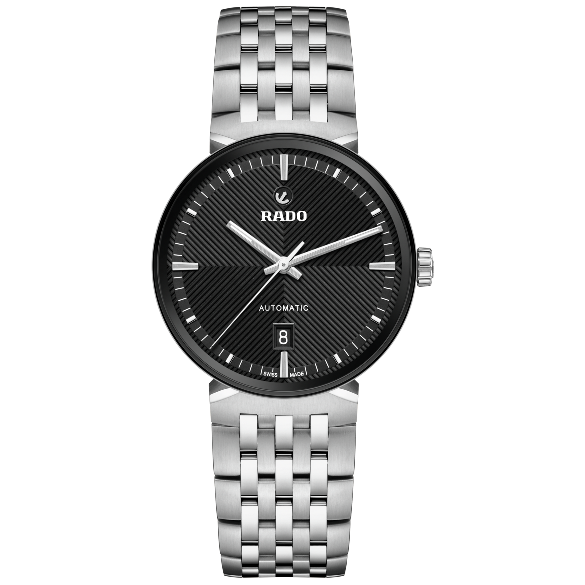 Discover the timeless blend of Swiss precision and elegance with the iconic Rado Florence. The 39 mm case is crowned with an edge-to-edge sapphire crystal, featuring a black metallised edge that matches the dial. This sapphire crystal functions both as the protective front and as a bezel, seamlessly integrated into the case to enhance the Florence iconic refined profile. Serving as a theatre scene, the black dial showcases extreme attention to detail with its sophisticated embossed pattern. The contrasting rhodium coloured applied hour markers, topped by the moving Rado anchor symbol, finished with brushing and polishing, create a hypnotising contrast against the black background. The case is complemented by a stainless steel bracelet, featuring brushed and polished links, and is secured with a stainless steel three-fold clasp. Beneath the box-shaped sapphire crystal case back lies the soul of the Florence: the Automatic R763 calibre. Finely regulated in five positions and featuring a Nivachron™ hairspring, this movement delivers a high level of accuracy and a robust 80-hour power reserve, underlining Rado's commitment to perfection.