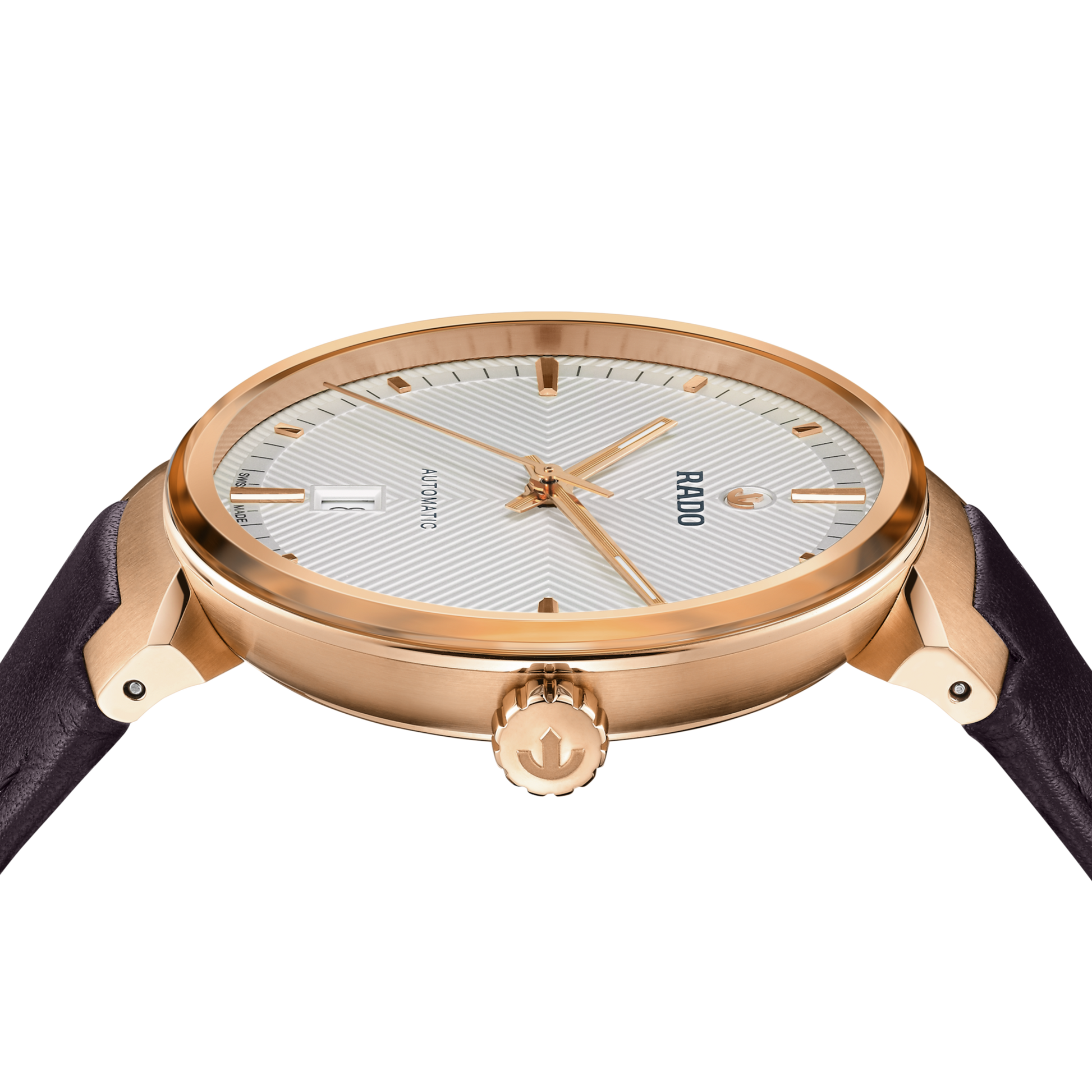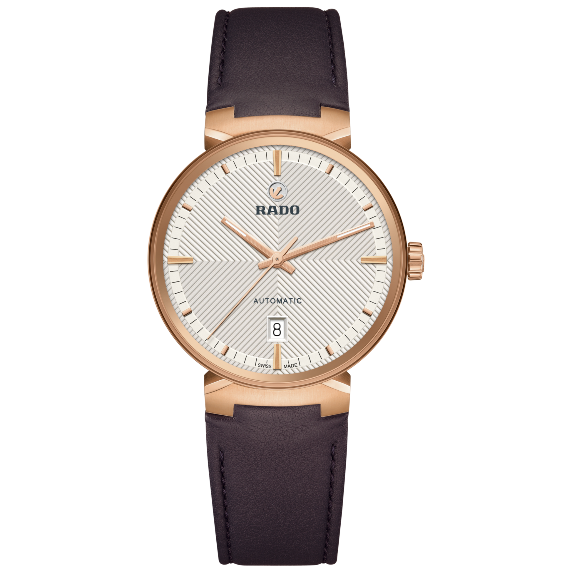 Discover the timeless blend of Swiss precision and elegance with the iconic Rado Florence. The 39 mm case is crowned with an edge-to-edge sapphire crystal, featuring a metallised edge that matches the rose gold colour of the case. This sapphire crystal functions both as the protective front and as a bezel, seamlessly integrated into the case to enhance the Florence iconic refined profile. Serving as a theatre scene, the silver white dial showcases extreme attention to detail with its sophisticated embossed pattern. The contrasting rose gold-coloured applied hour markers, topped by the moving Rado anchor symbol, finished with brushing and polishing, create a hypnotising contrast against the silver-white background. The case is complemented by a brown leather strap, perfectly proportioned to the end links, and secured by a rose gold PVD-coated stainless steel pin buckle. Beneath the box-shaped sapphire crystal case back lies the soul of the Florence: the Automatic R763 calibre. Finely regulated in five positions and featuring a Nivachron™ hairspring, this movement delivers a high level of accuracy and a robust 80-hour power reserve, underlining Rado's commitment to perfection.